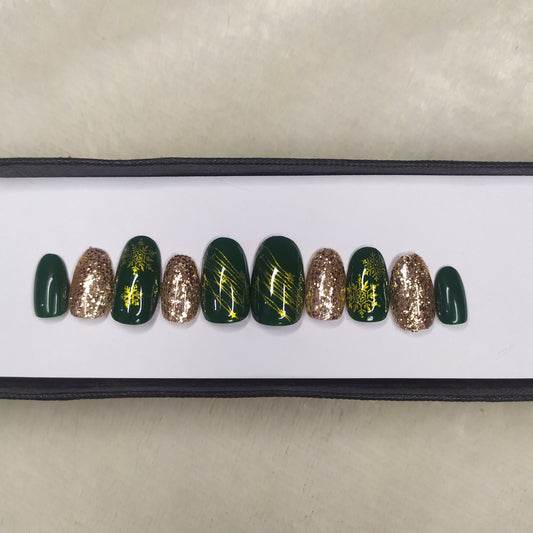 The NailzStation Glossy Green Glitter Christmas Press on Fake Artificial Nails Set with glue, filer, sticker application kit // 1282
