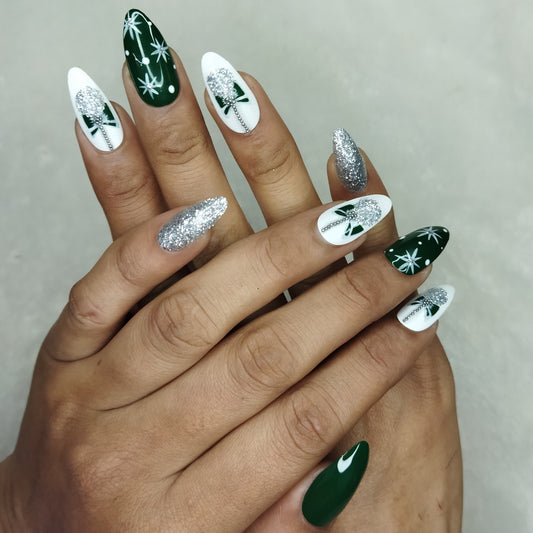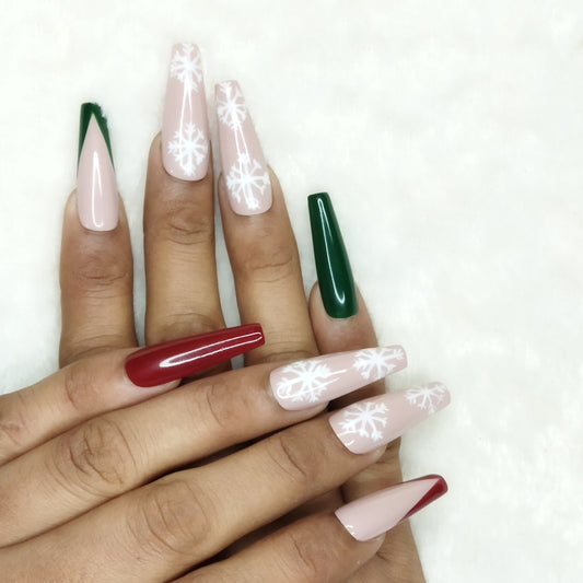 Christmas Collection : Glossy Green and Red Snowflakes Press on Nails Set