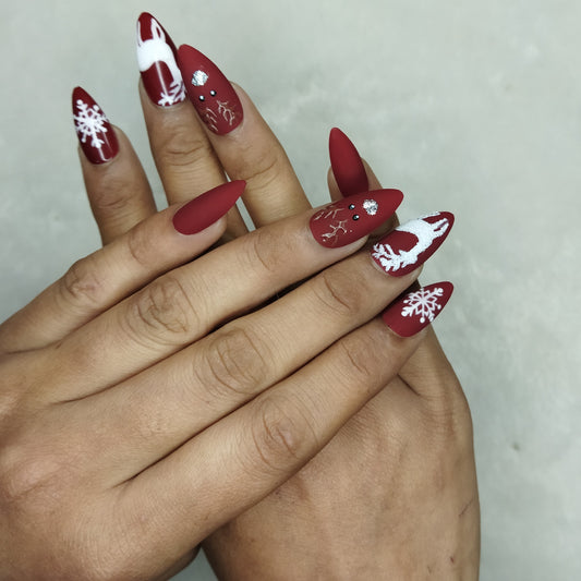 Christmas Collection : Matte Maroon Snowflakes Press on Nails Set