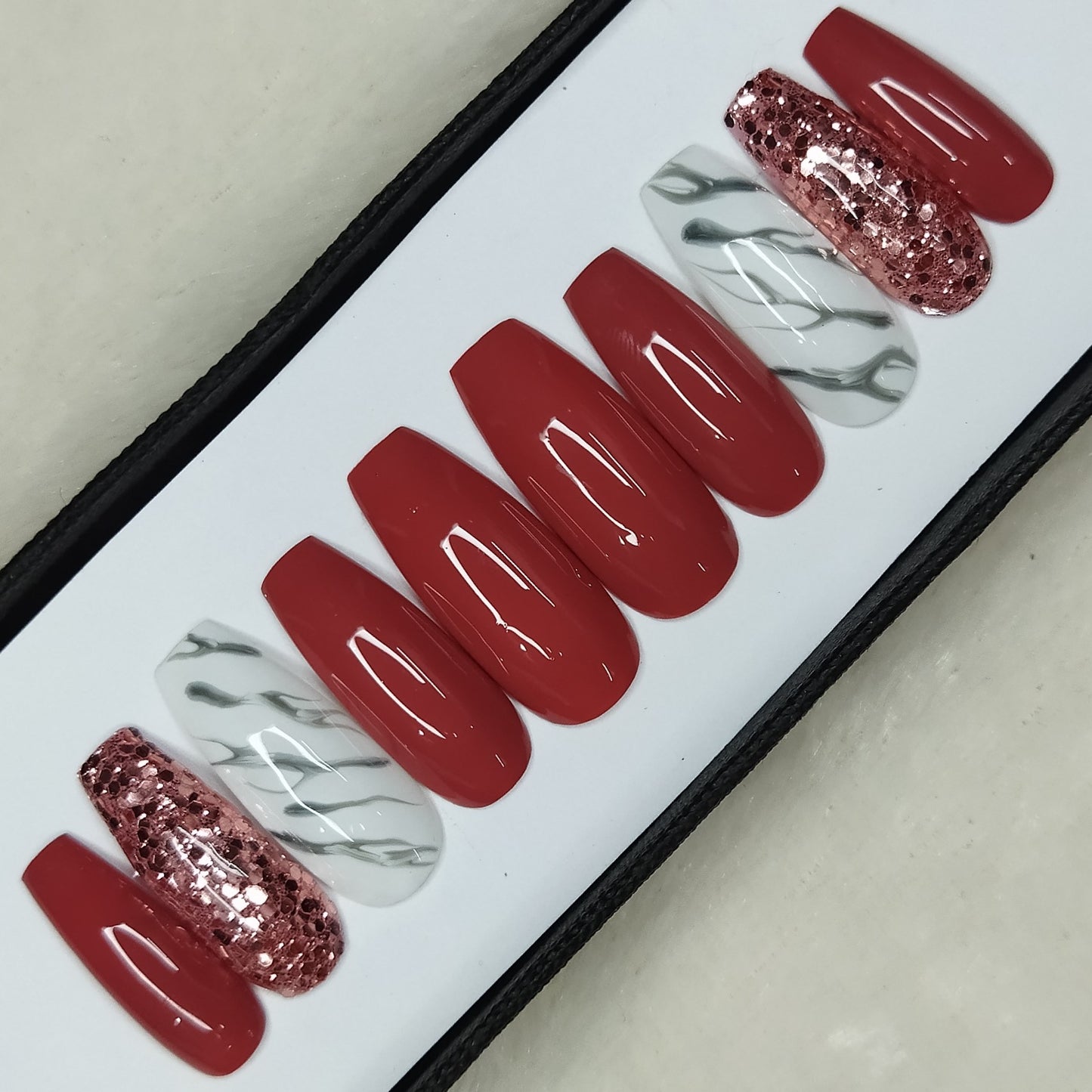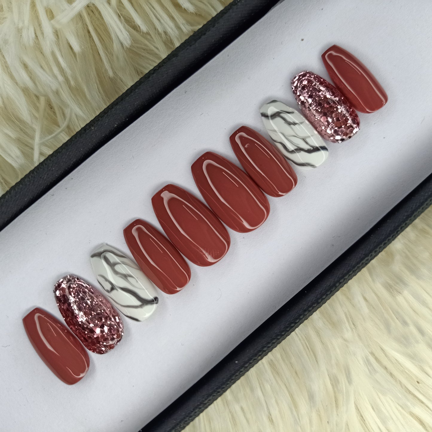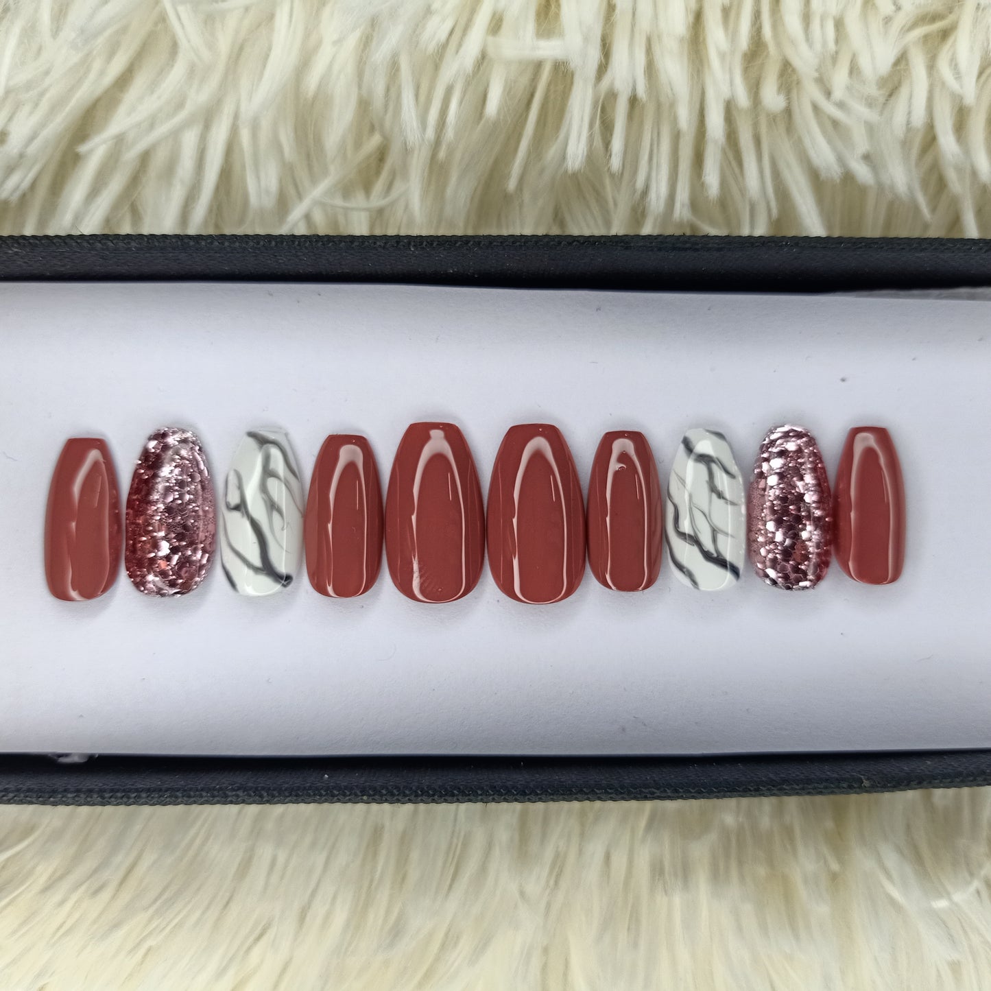 Glossy Dark Nude with marble and glitter Press on Nails Set // 281