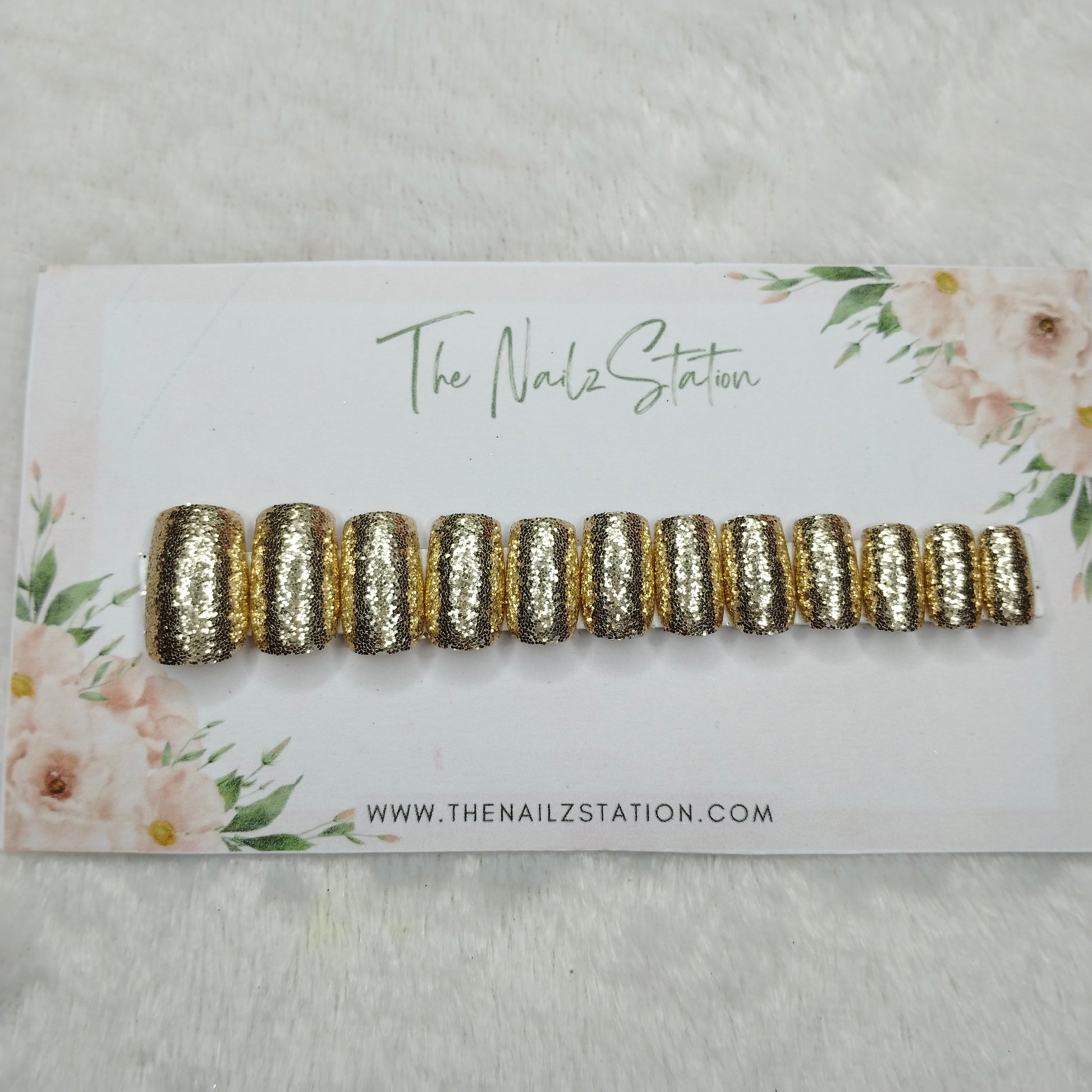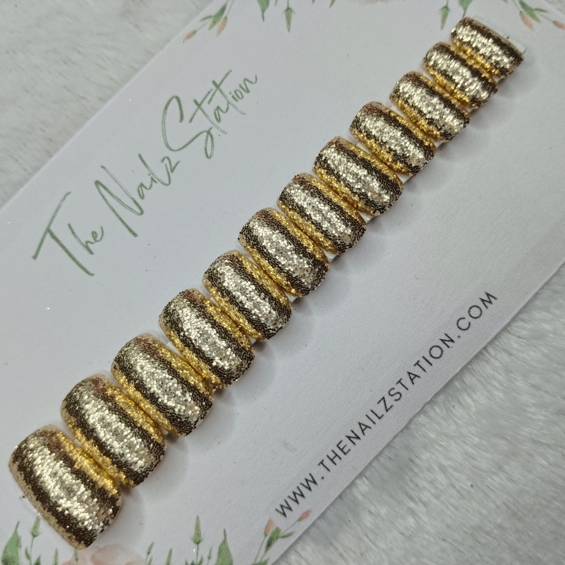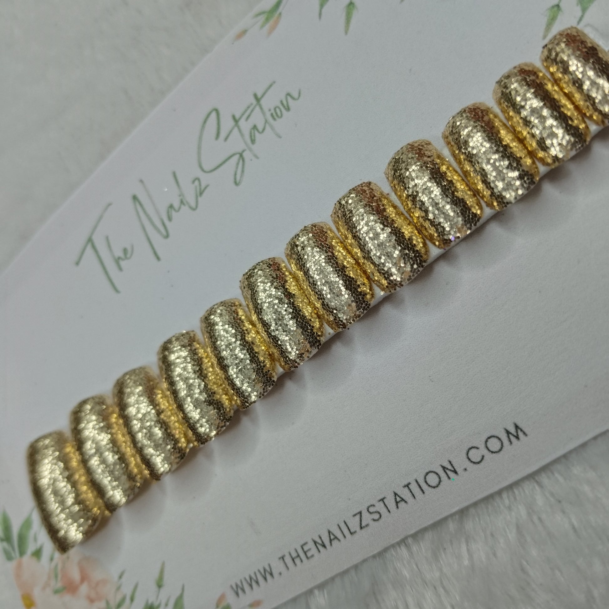 The NailzStation Glossy Golden Glitter Press on Fake Artificial Nails Set with glue, filer, sticker application kit // 1494