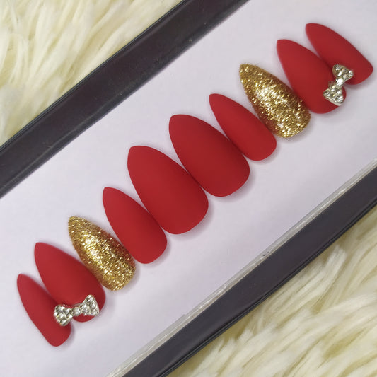 Matte Red with Glitter and 3D Bow Press on Nails Set // 205