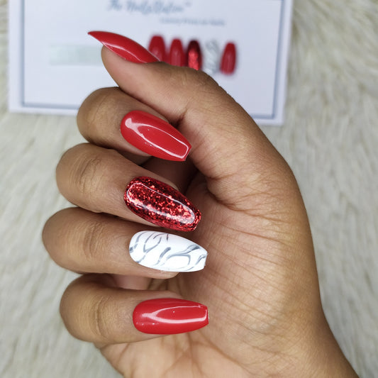 Glossy Red with marble and glitter Press on Nails Set // 406