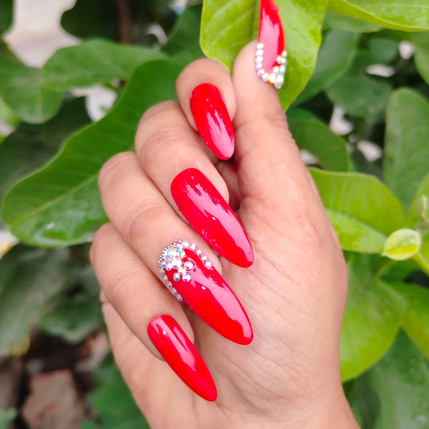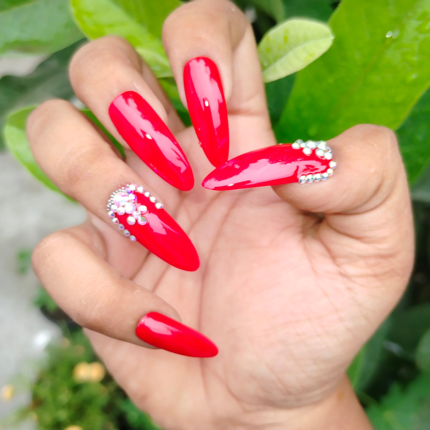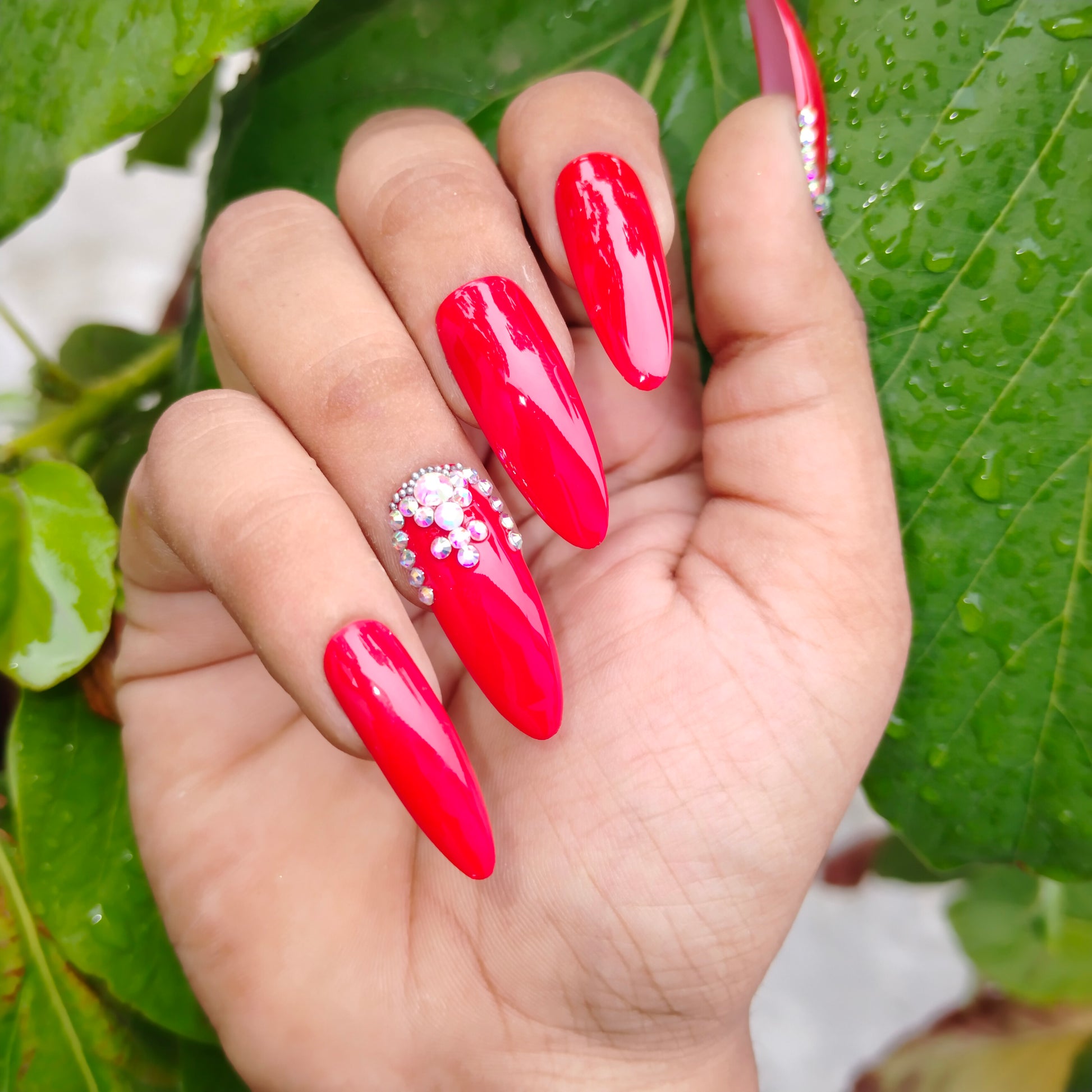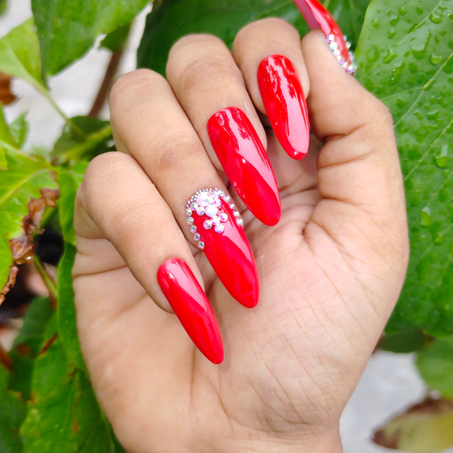 The NailzStation Glossy Red Studded Press on Fake Artificial Nails Set with glue, filer, sticker application kit // 1215