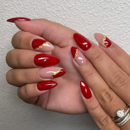 Glossy Red with golden French Press on Nails Set //382