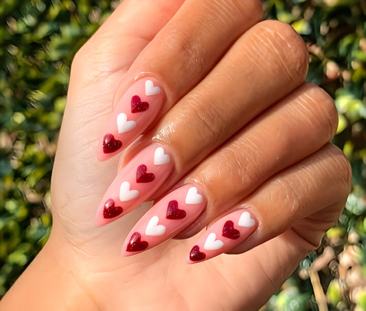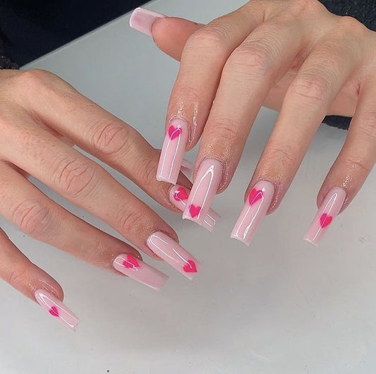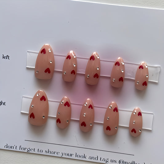 These press-on nails are designed for Valentine’s Day. They come in pink, red, and heart designs. Each set includes 20 nails in different sizes. The nails are reusable and come with an application kit. Perfect for short, medium, or long nails.