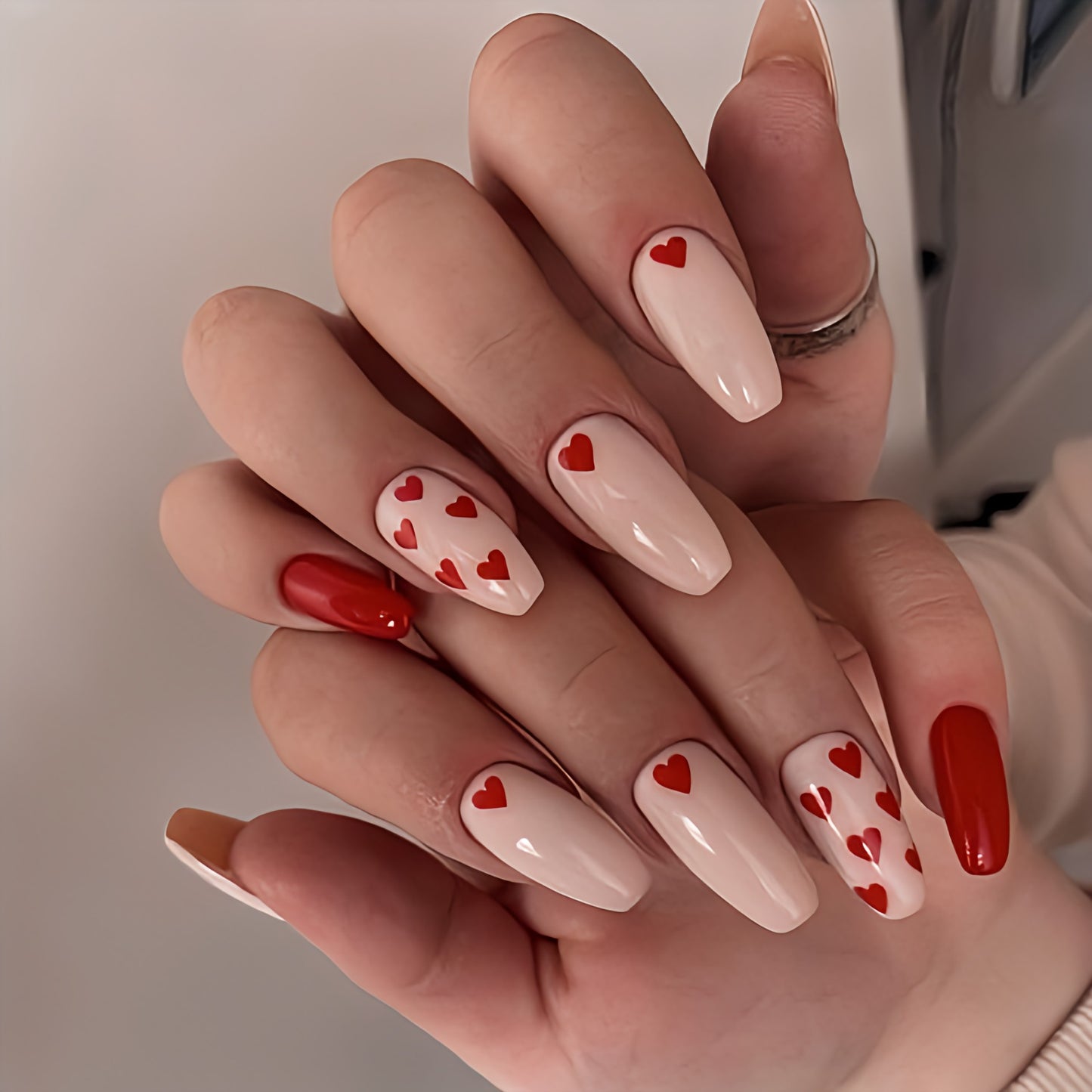Glossy Nude and Red Hearts Press on Fake Artificial Nails / tns1283