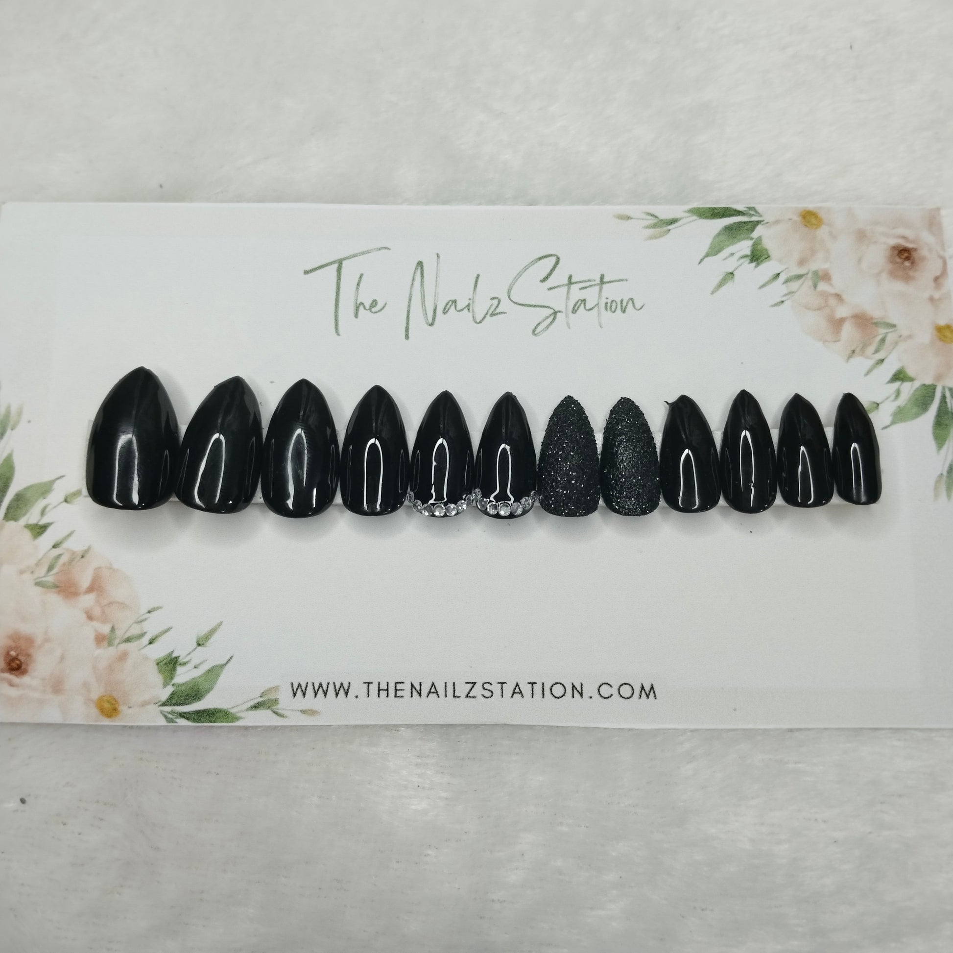 The NailzStation Glossy Black Glitter Studded Press on Fake Artificial Nails Set with glue, filer, sticker application kit // 1394