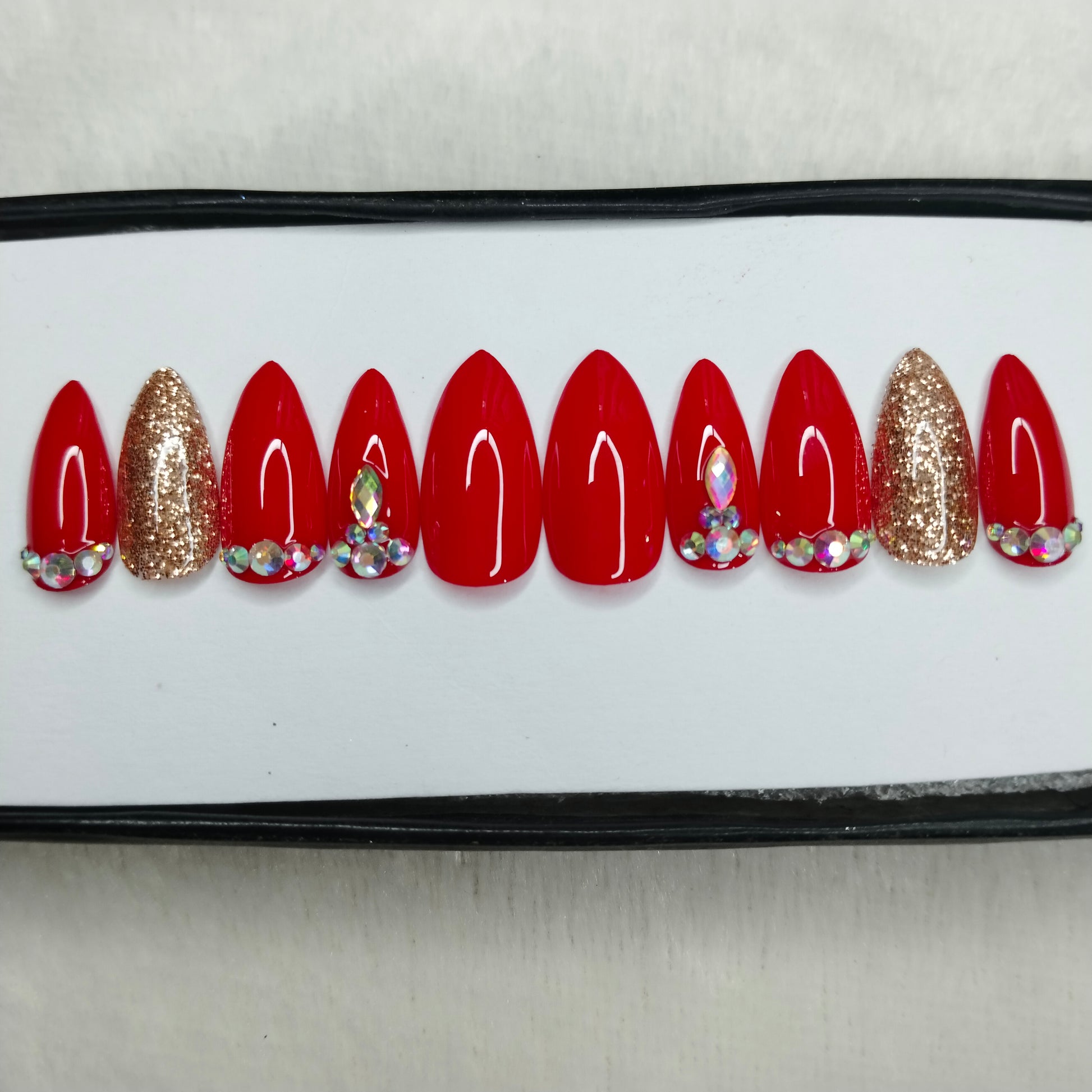 The NailzStation Glossy Red Glitter Studded Press on Fake Artificial Nails Set with glue, filer, sticker application kit // 1419