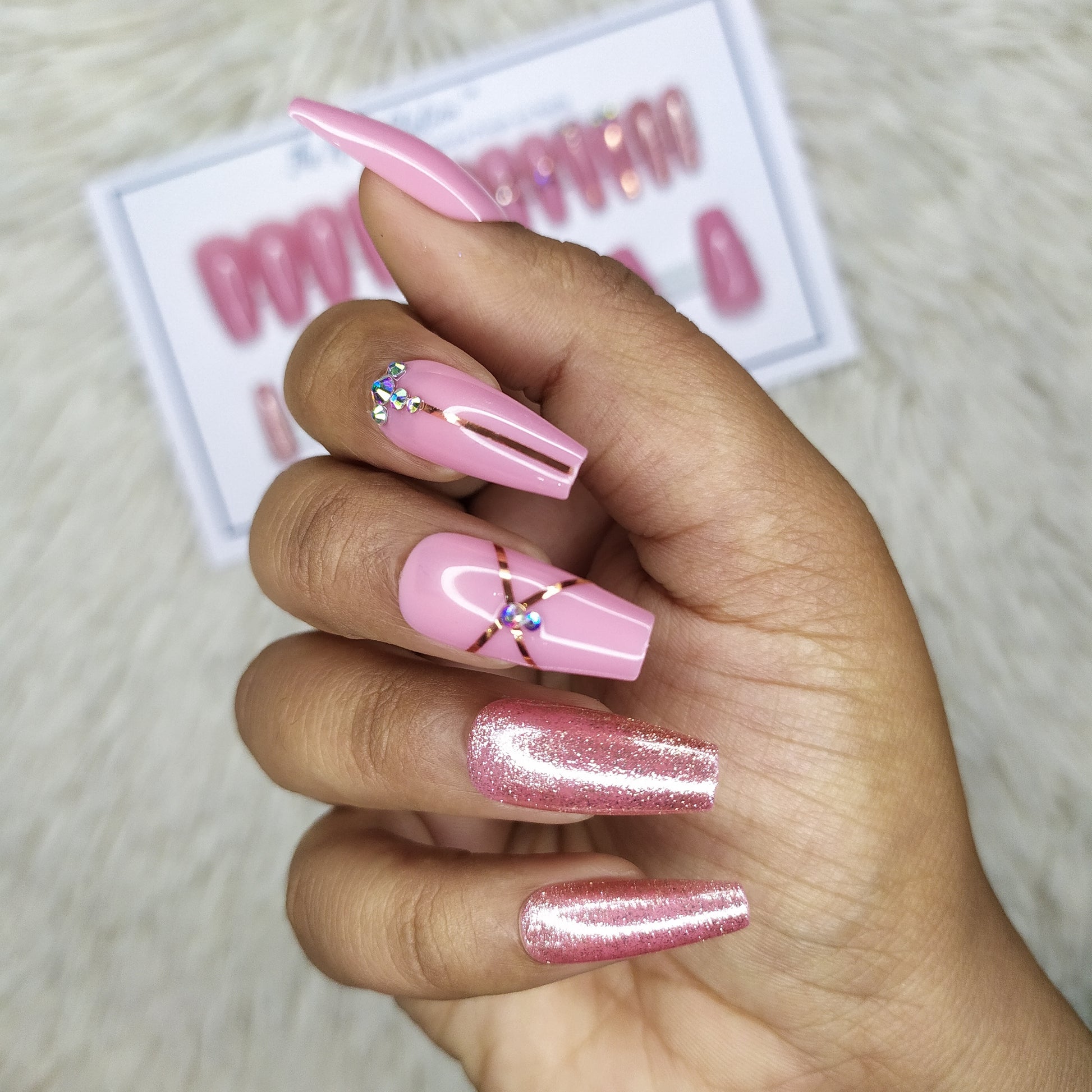 Glossy Pink Shimmer rhinestones Press on Nails Set in Medium Ballerina (RTS) // 458
