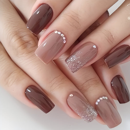 Lux Collection : Glossy Nude Glitter Studded Press on Nails Set // 563