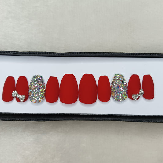 Matte Red with Rhinestones and 3D Bow Press on Nails Set // 206