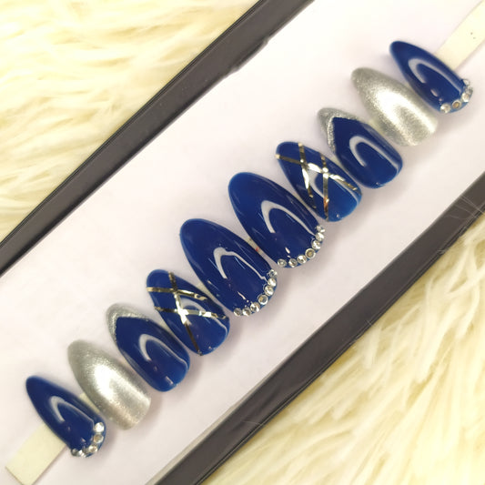Glossy Blue with Silver Rhinestones Press on Nails Set 149