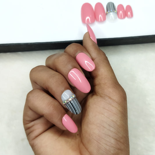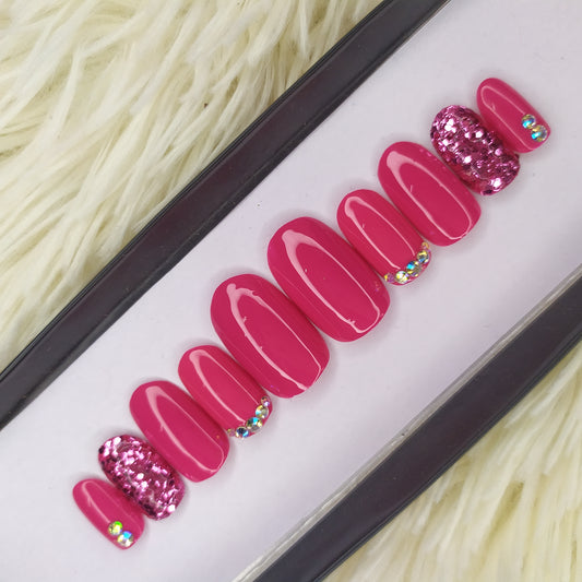 Pink Glossy with Glitter and Rhinestones Press on Nails Set // 236