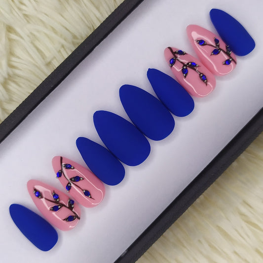 Matte blue rhinestones floral Press on Nails Set 257