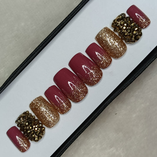 Glossy Pink Glitter and Rhinestones Press on Nails Set // 478