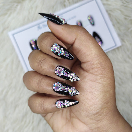 Glossy Black Mauve Rhinestones Press on Nails Set