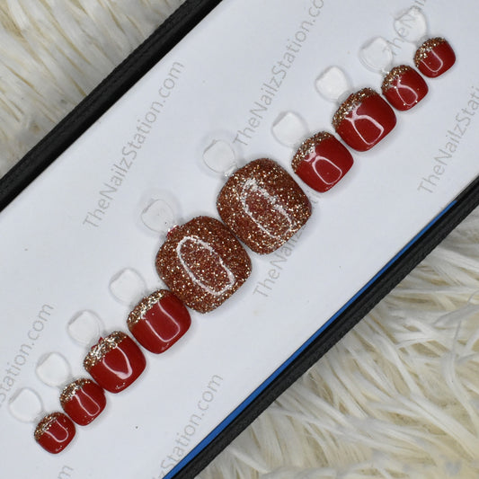 Glossy Red with golden french Press on Toe Nails Set // 382