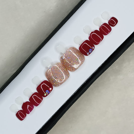 Glossy Red Rhinestones with Glitter Press on Toe Nails Set // 1034