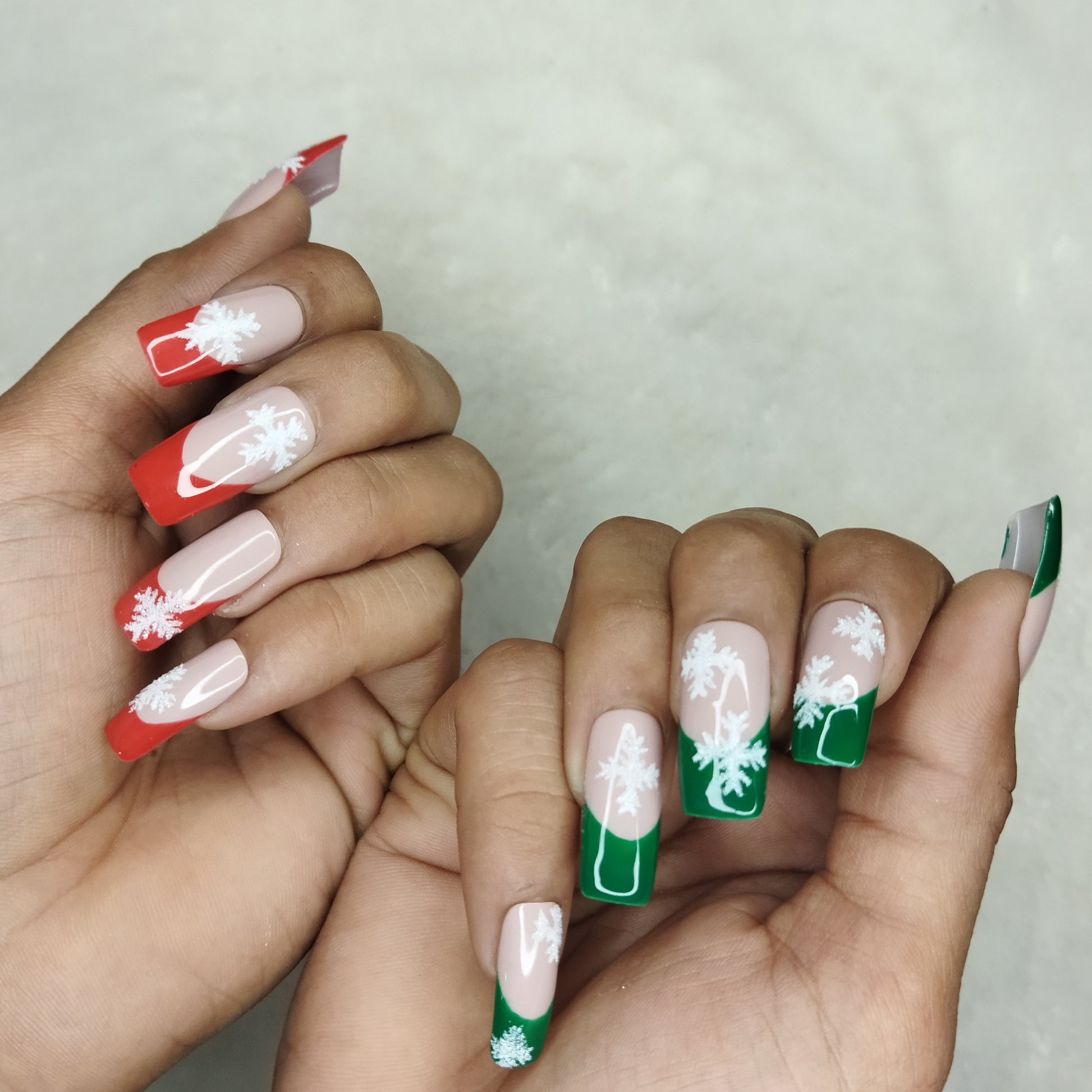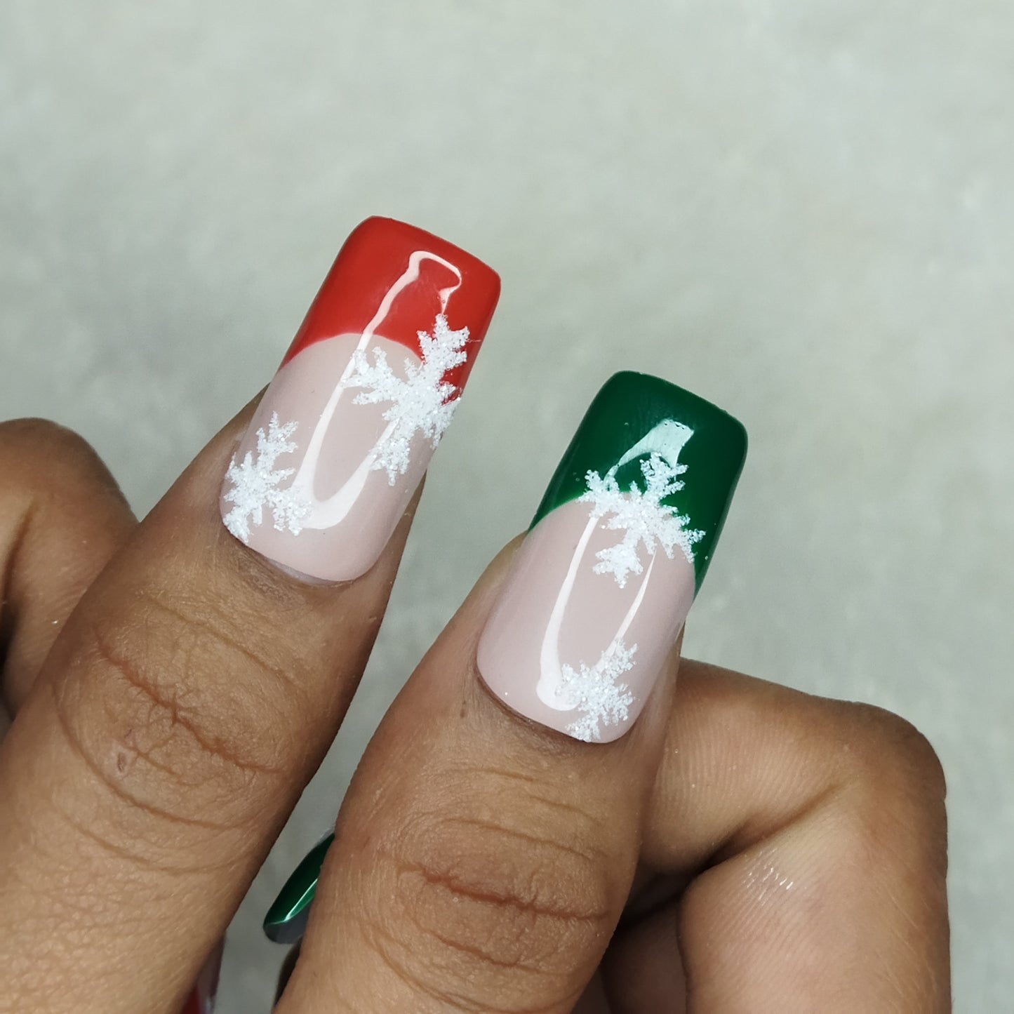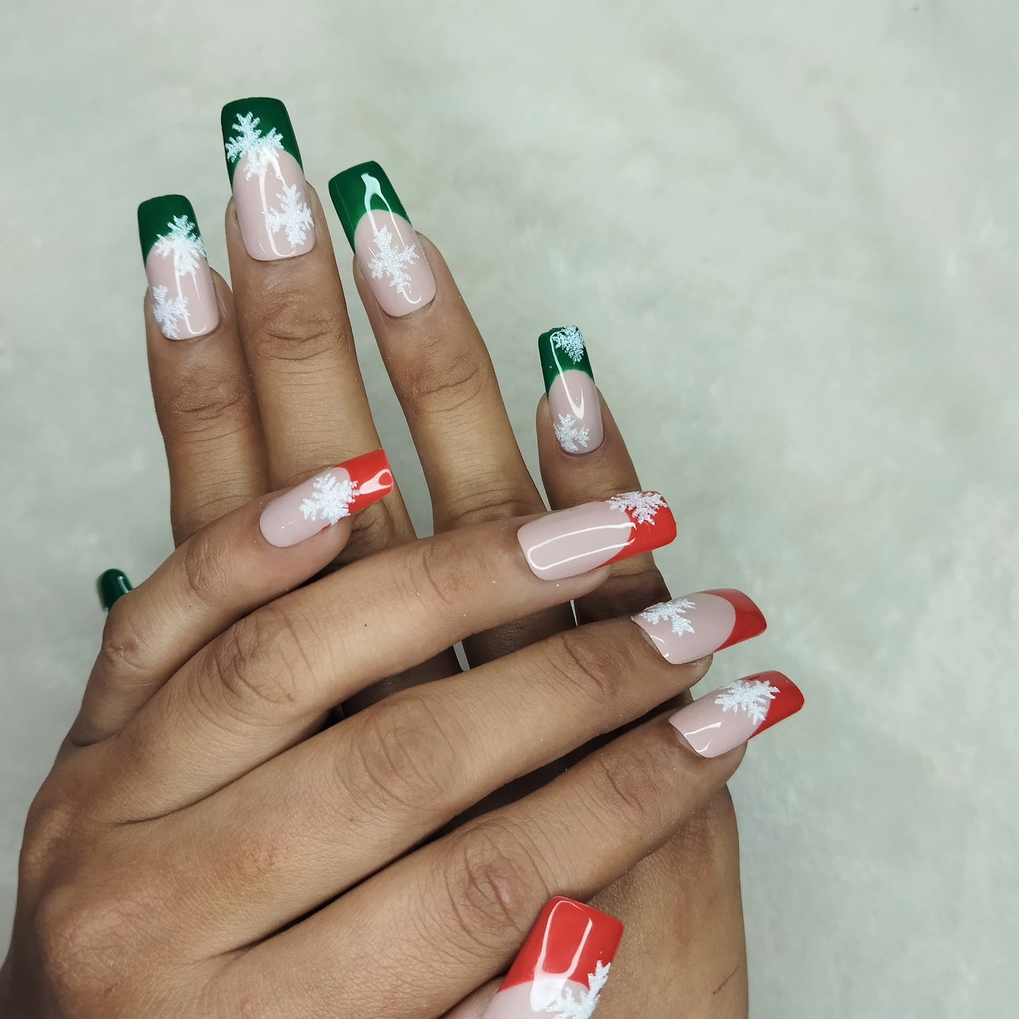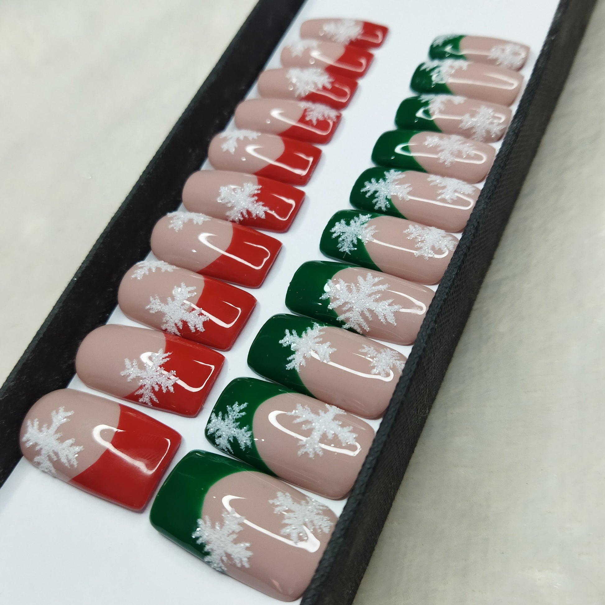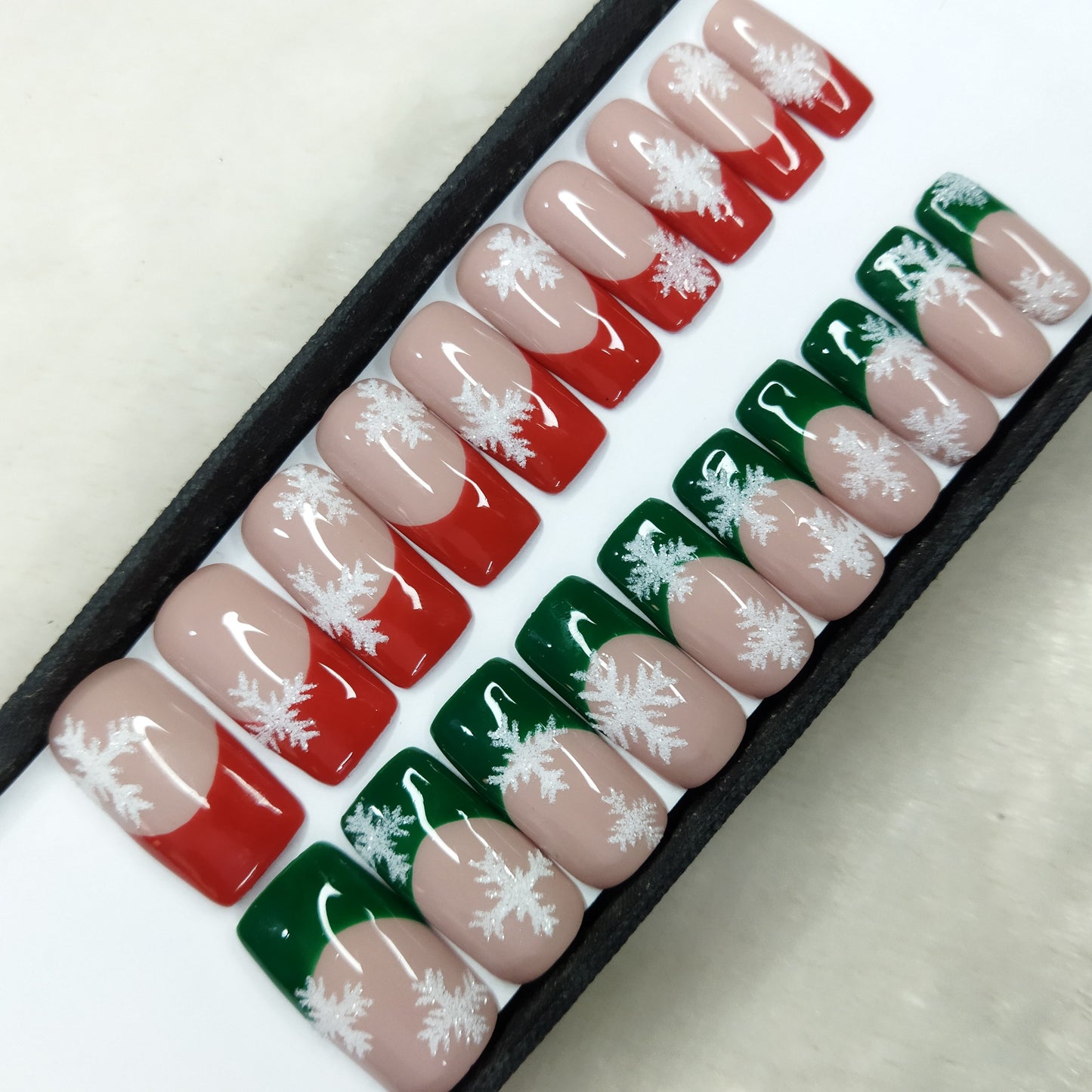 Christmas Collection : Glossy Green and Red Snowflakes Press on Nails Set