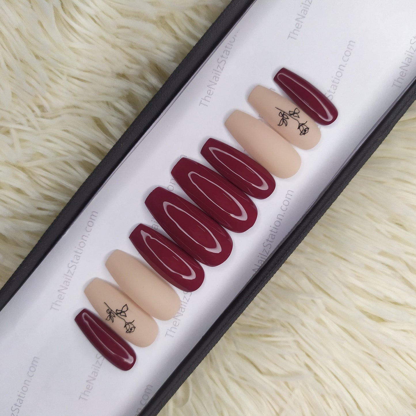 Dark Pink and Nude flower Press on Nails Sets // 339