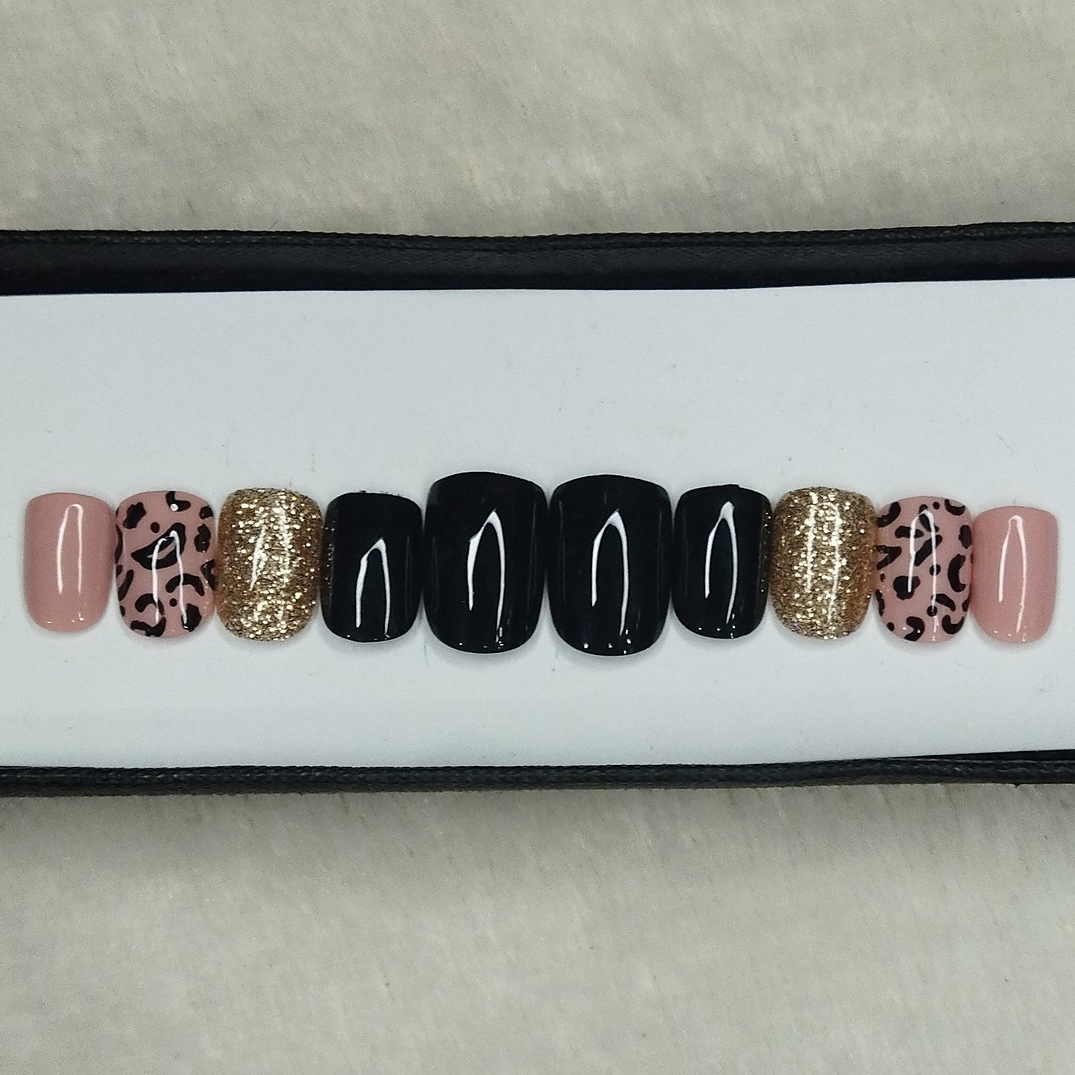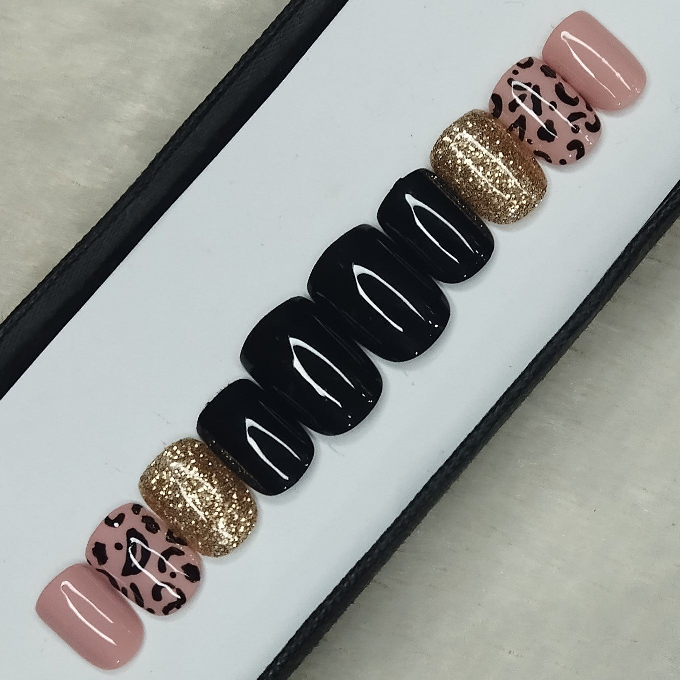 Glossy Black Animal Print Glitter Press on Nails Set // 750