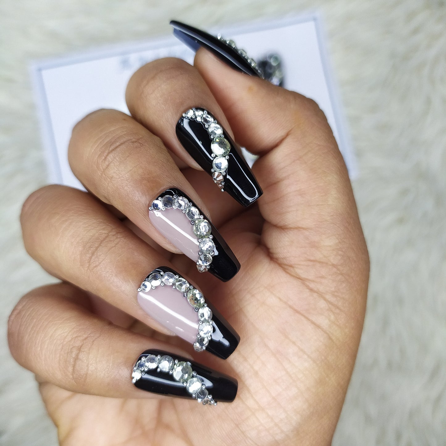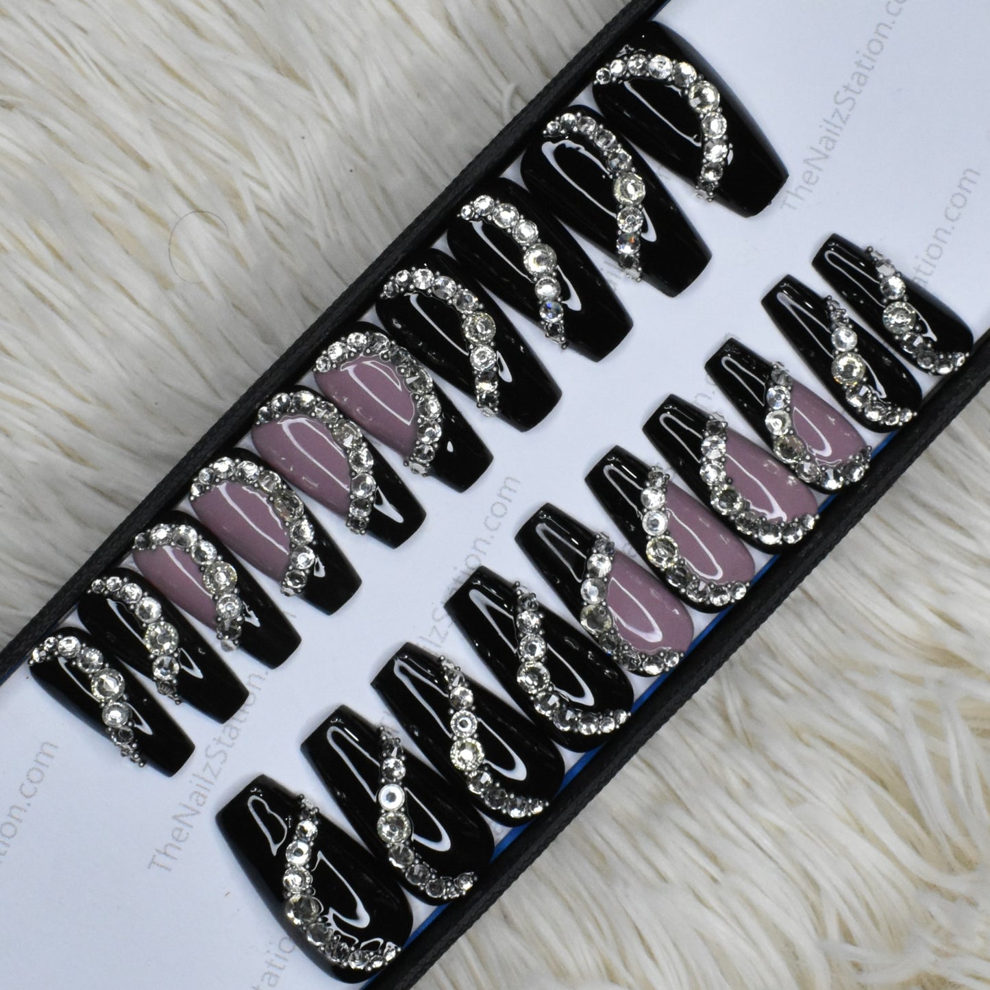 Glossy Black Mauve Rhinestones Press on Nails Set