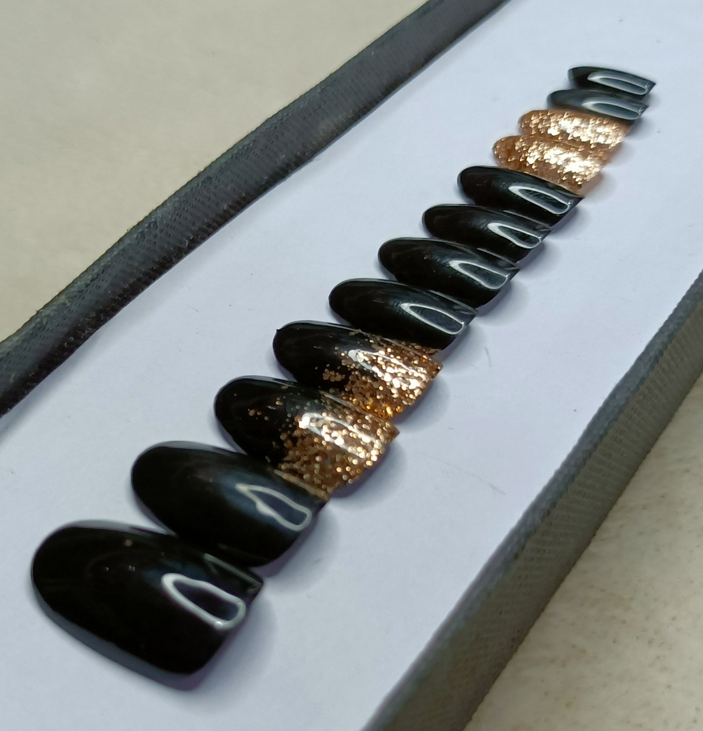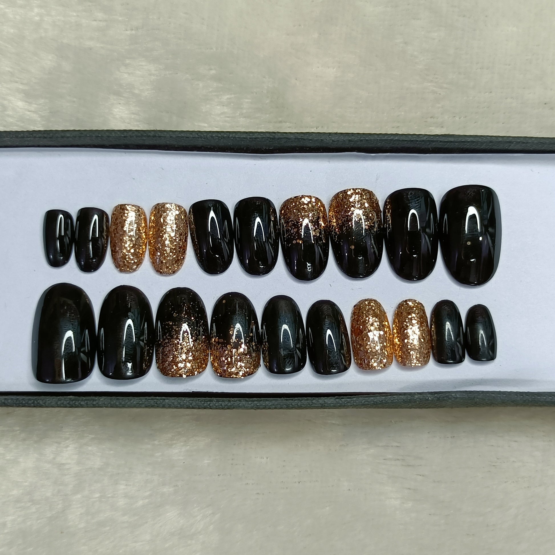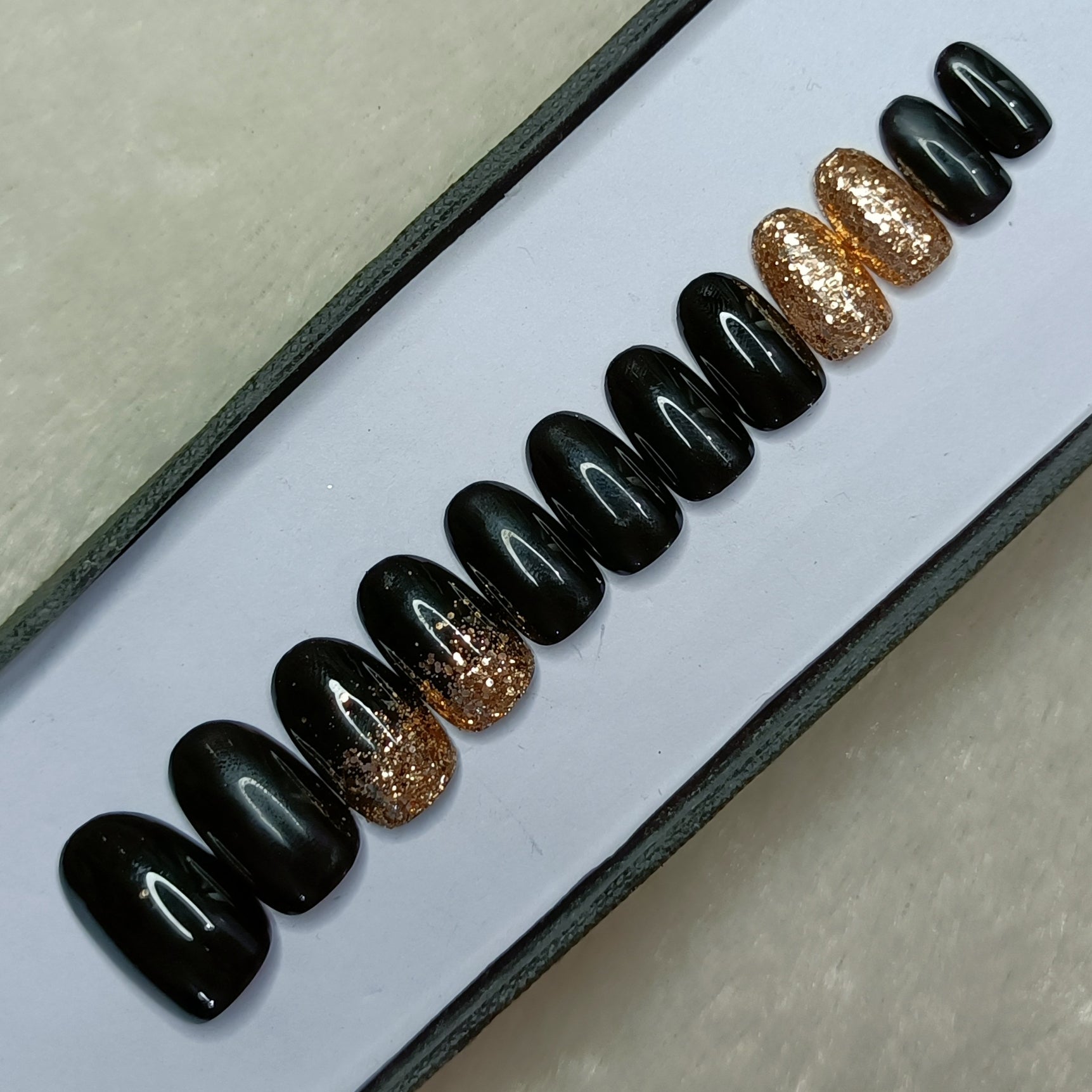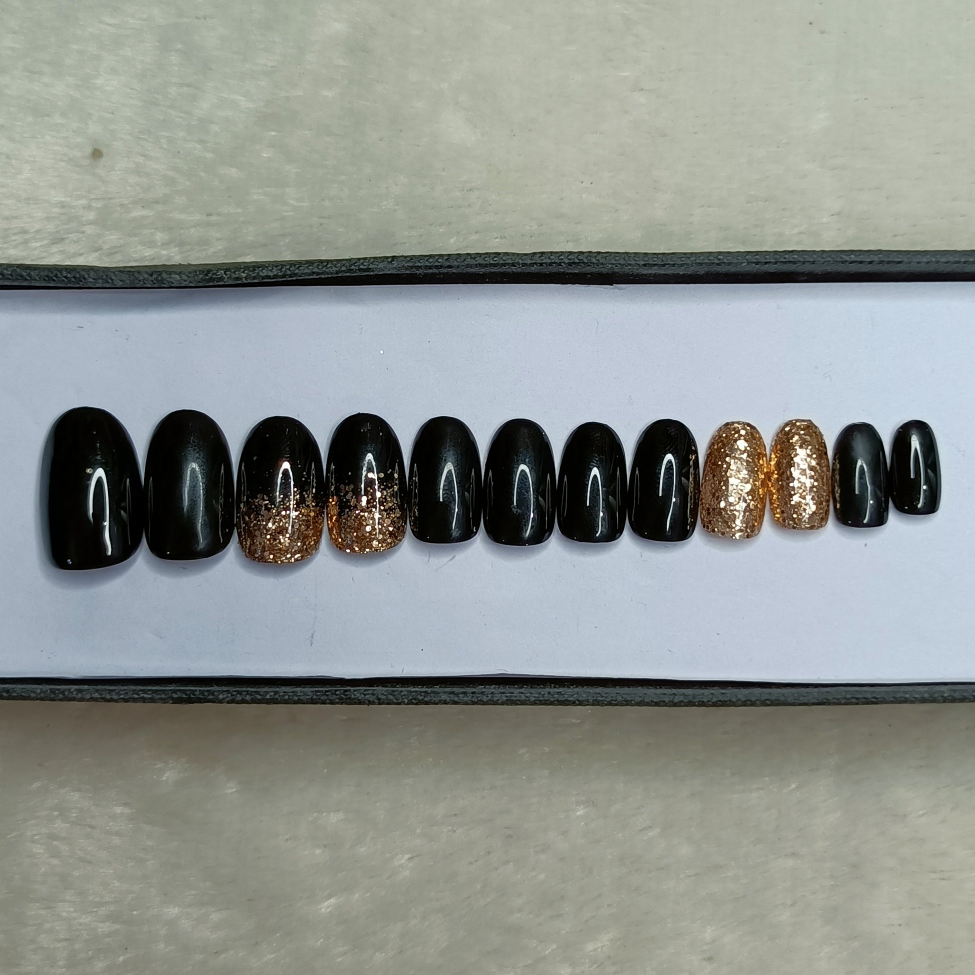 Glossy Black with Golden Glitter Glitter Press on Nails Set / 990