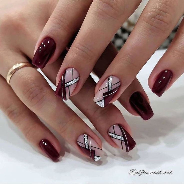 Glossy Dark Maroon Geometric Press on Fake Nails // tns238