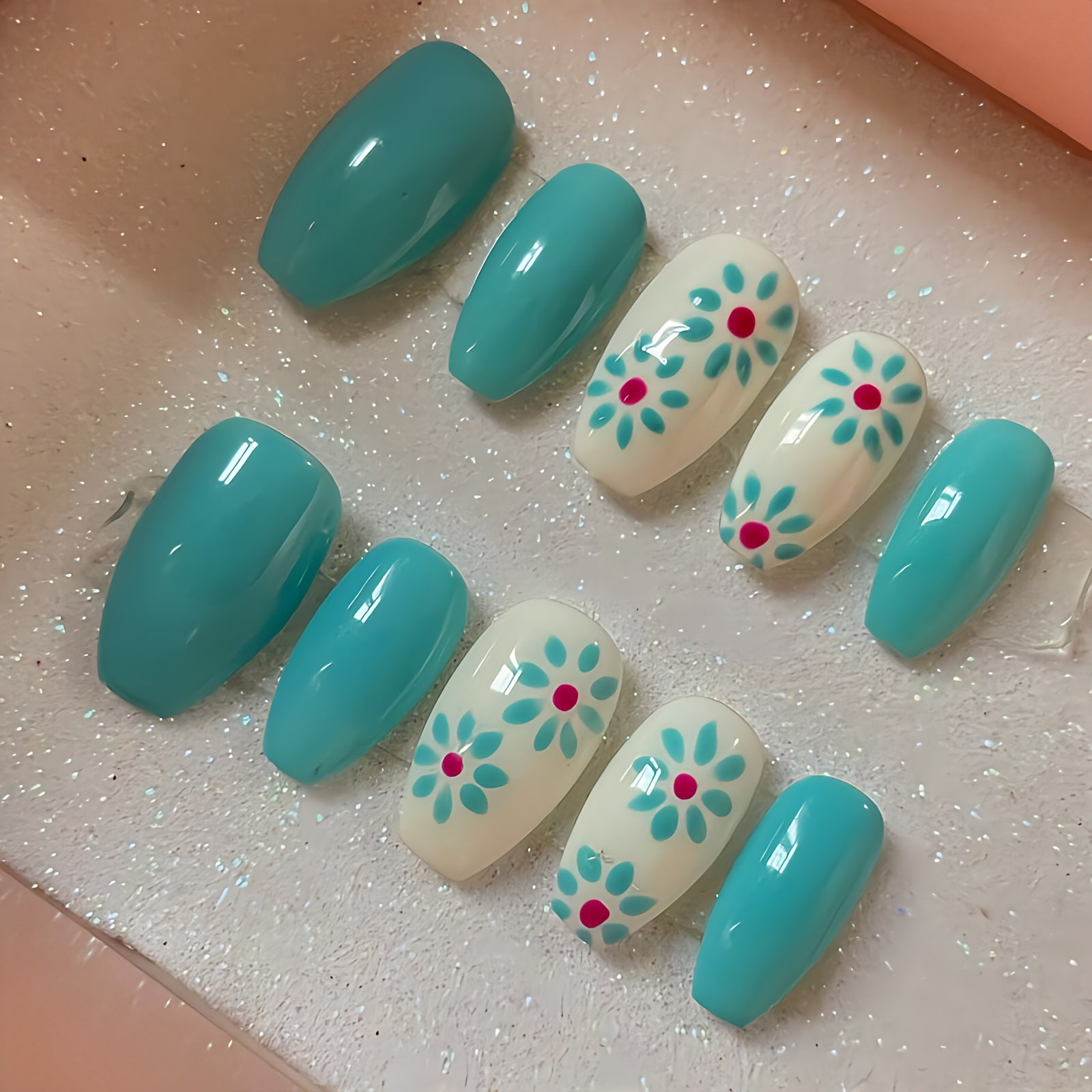 Glossy Light Blue Floral Press on Fake Nails // tns898