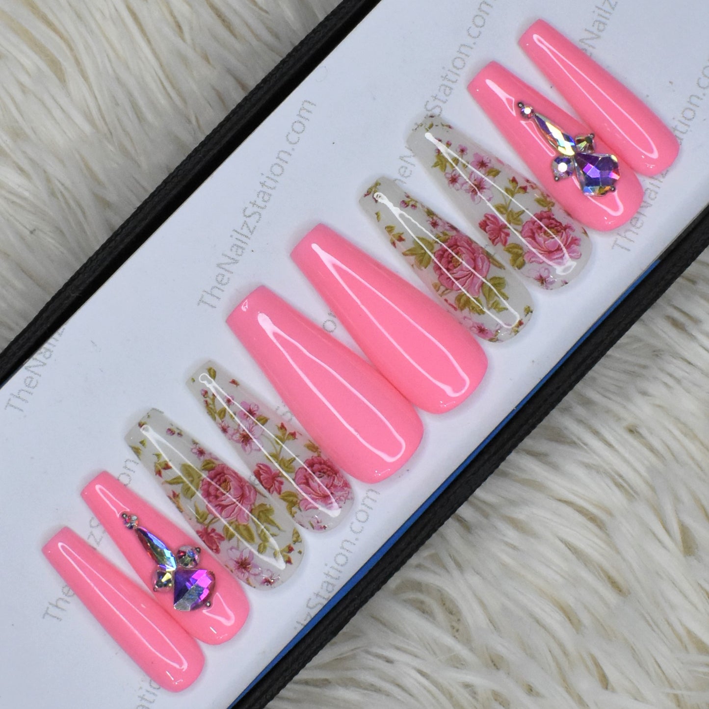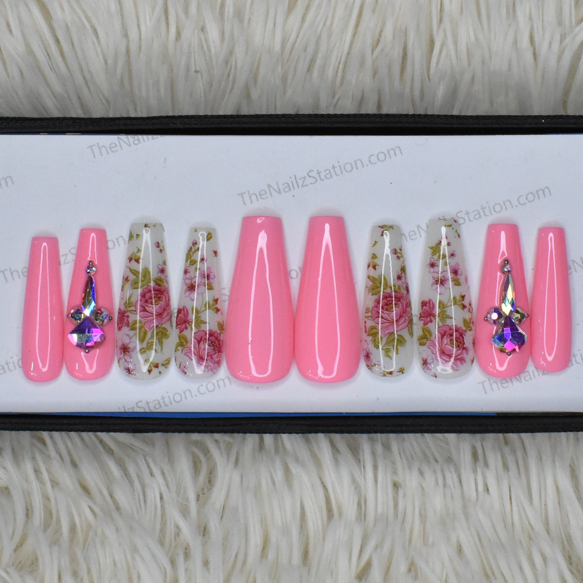 Glossy Light Pink Floral Rhinestones Press on Nails Set // 412