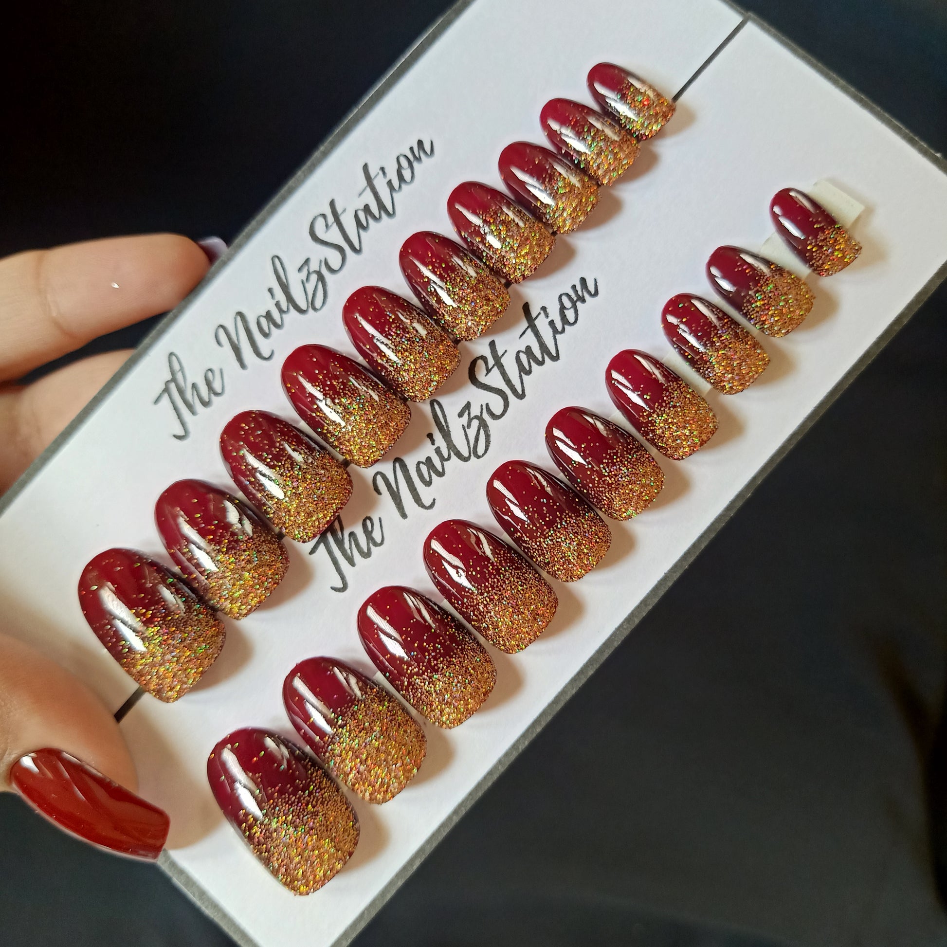 Glossy Maroon Holo Golden Glitter Ombre Press on Nails Set (20 nails /Oval)