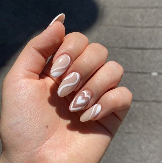 Glossy Nude Swirls Heart Press on Fake Artificial Nails / tns587