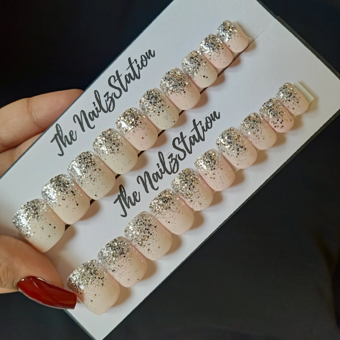 Glossy Off-White Silver Glitter Ombre Press on Nails Set (20 nails /Square)