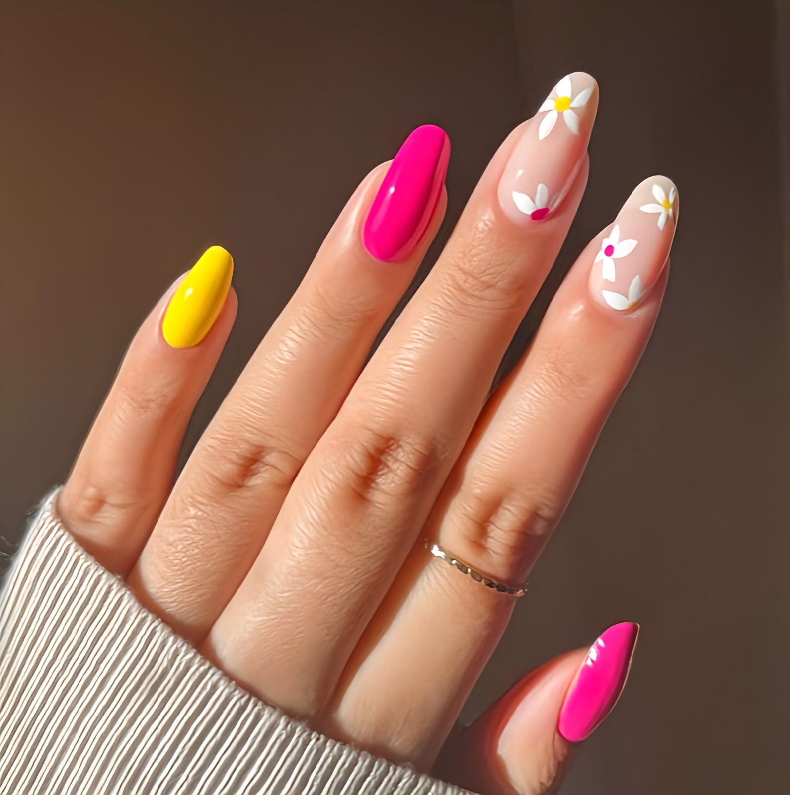 Glossy Pink and Yellow Floral Press on Fake Nails // tns974
