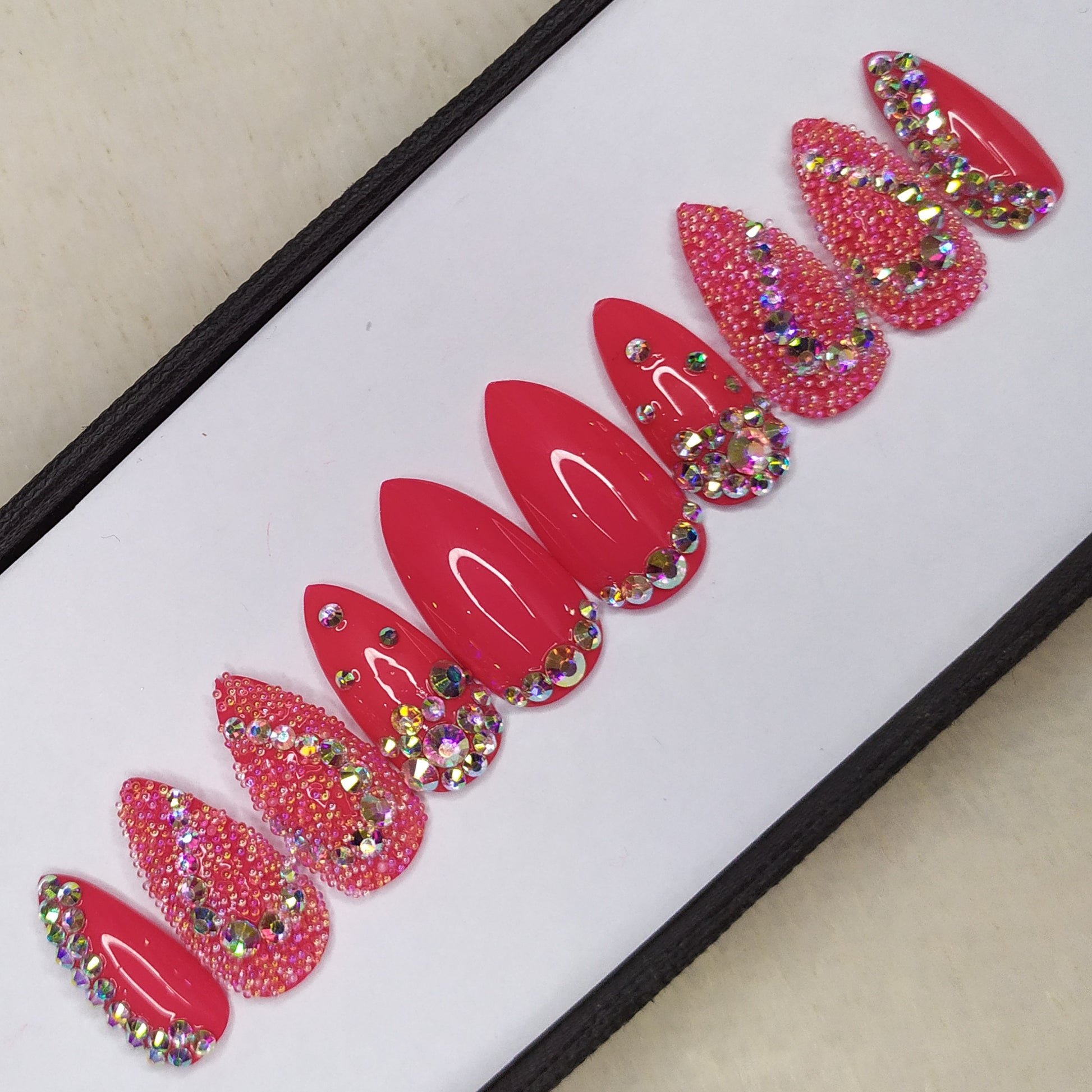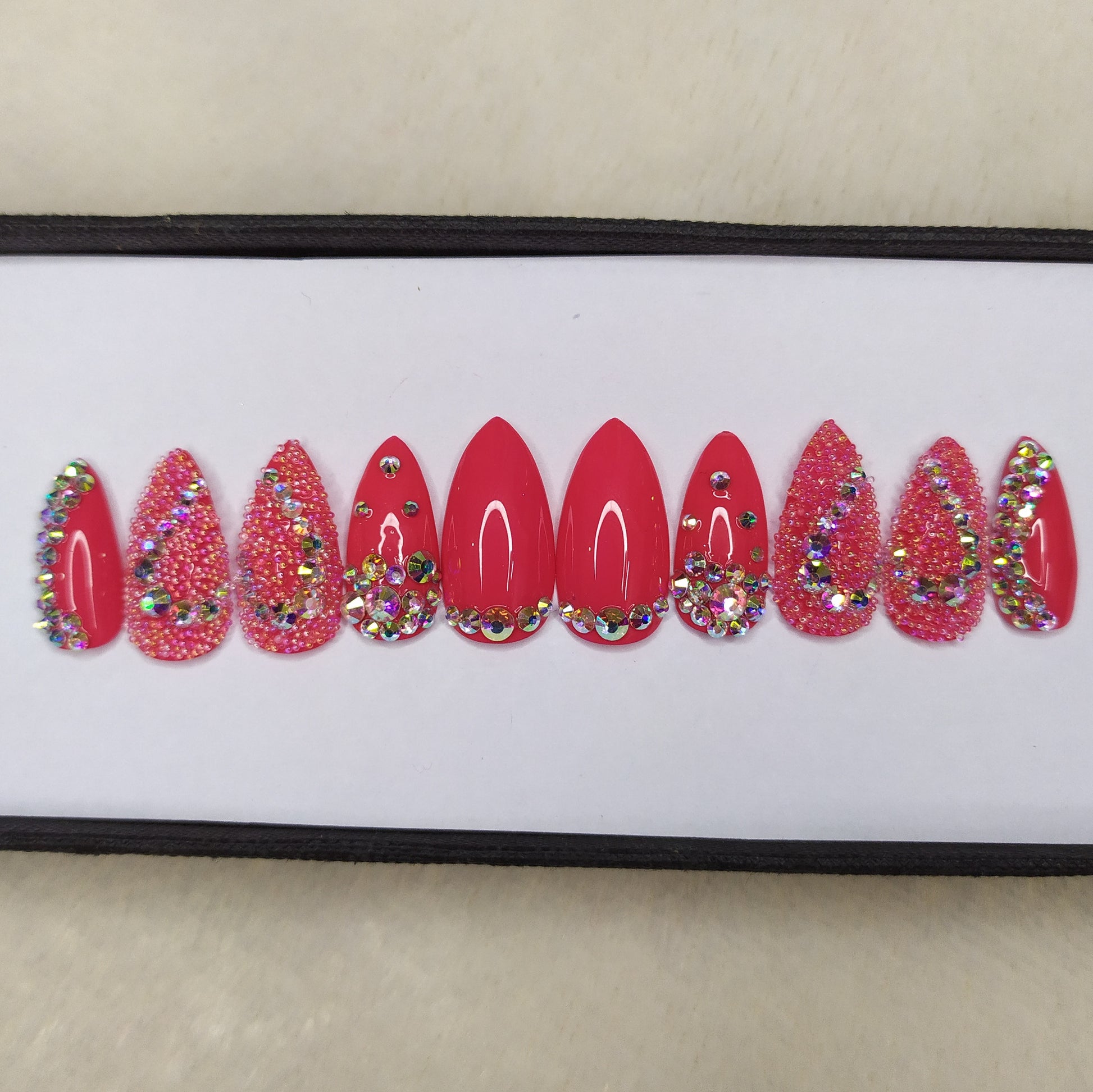 Glossy Pink Rhinestones Press on Nails Set // 515
