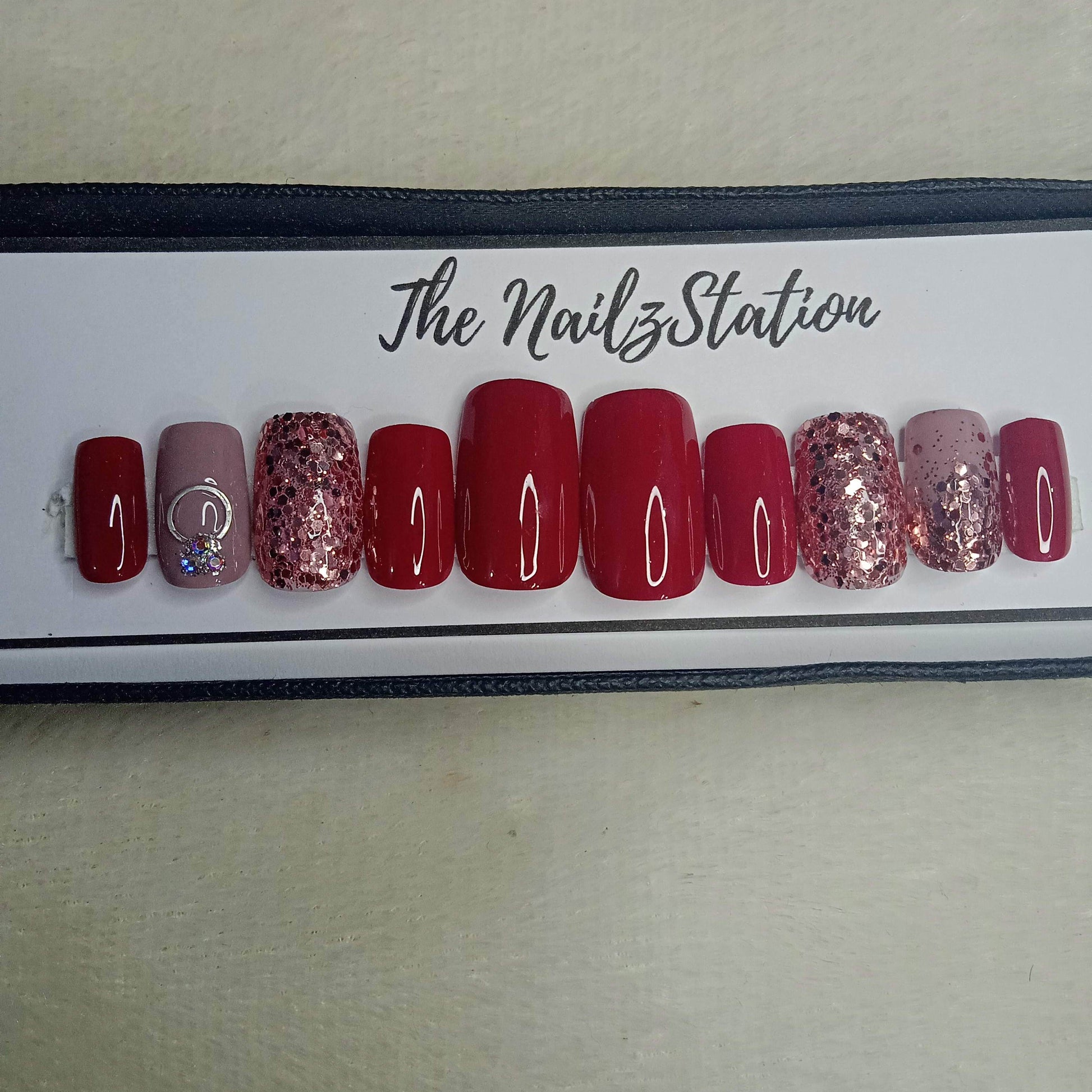 Glossy Red Glitter Engagement Ring Press on Nails // 994