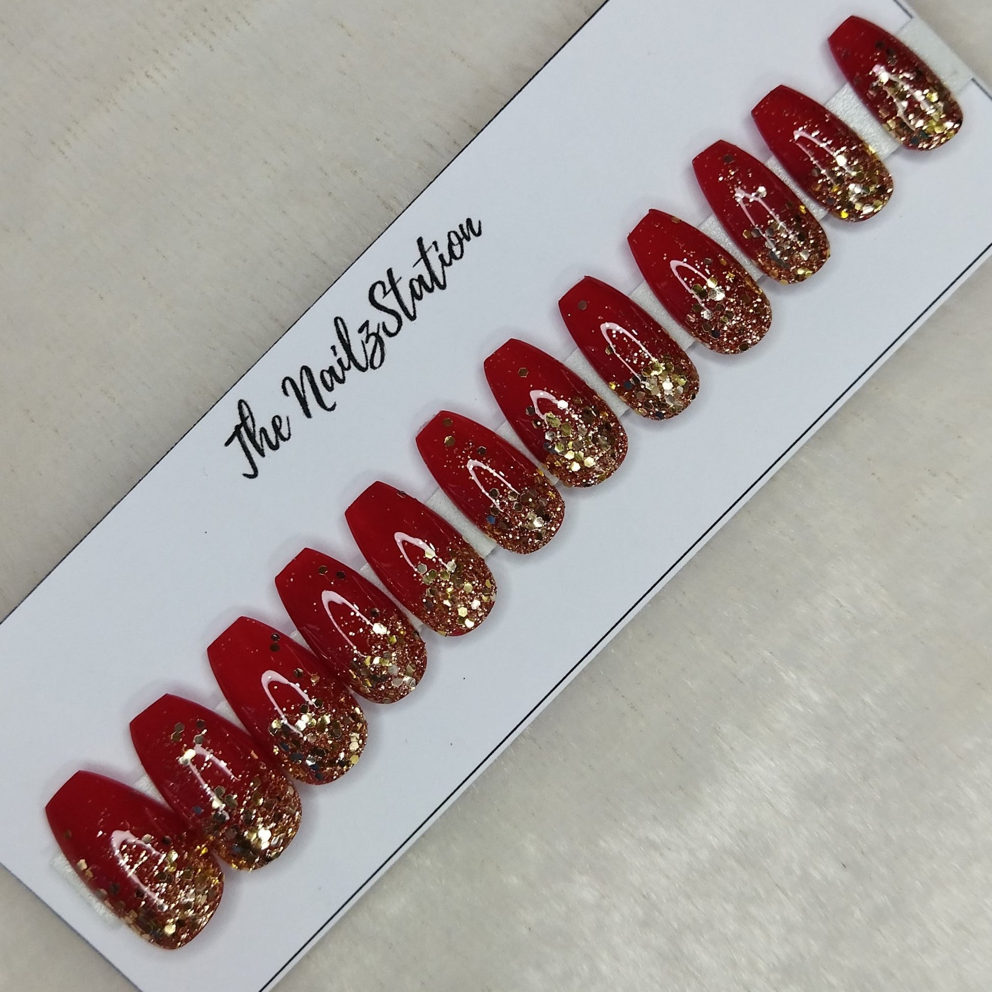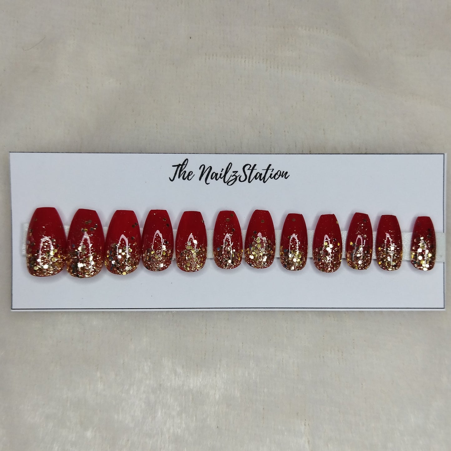Glossy Red With Golden Glitter Ombre Press on Nails Set // 679