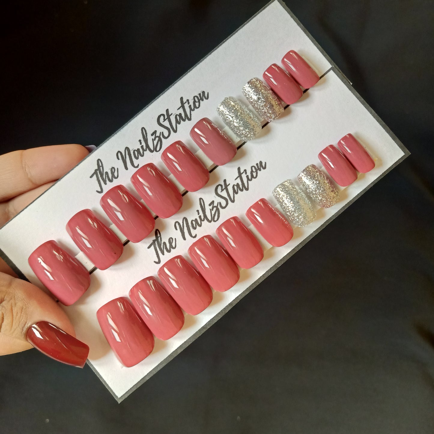 Glossy Rose Silver Glitter Press on Nails Set (20 nails / Medium Square)