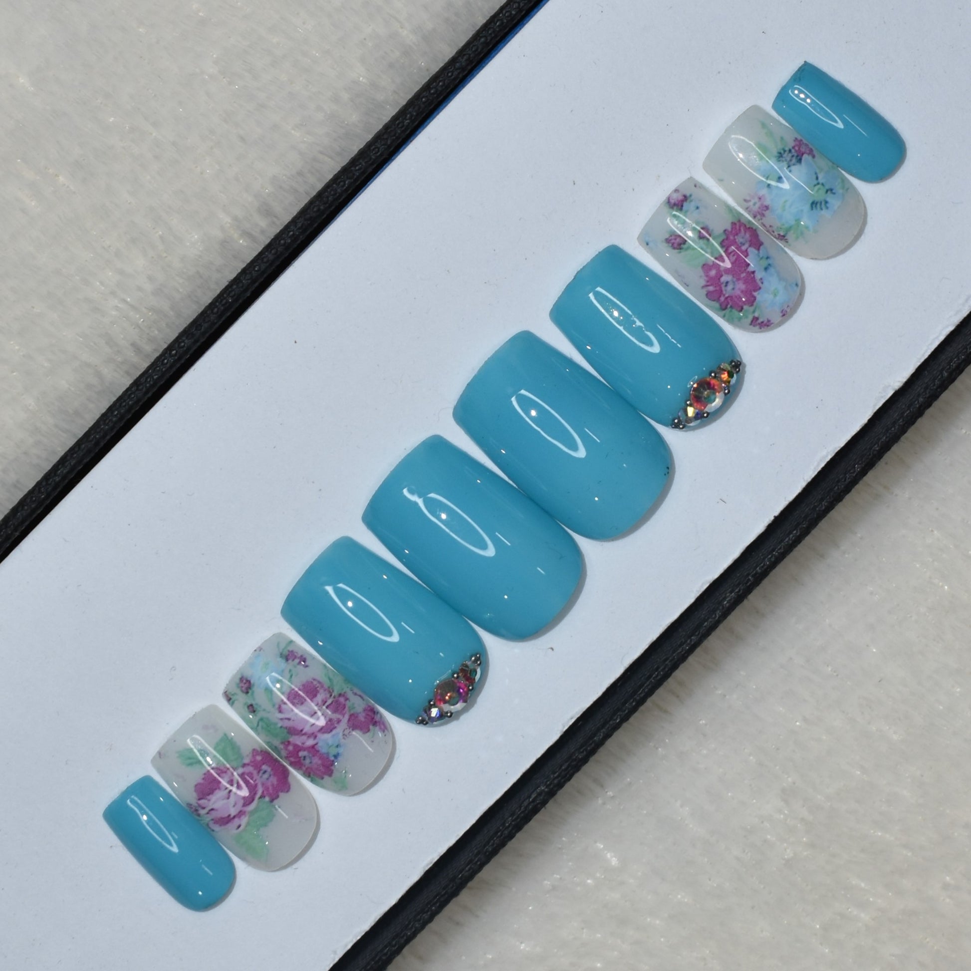 Glossy Light blue Floral Rhinestones Press on Nails Set // 328