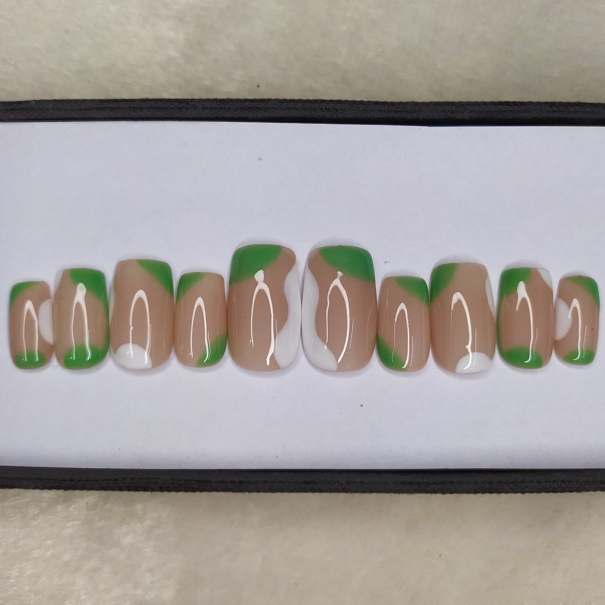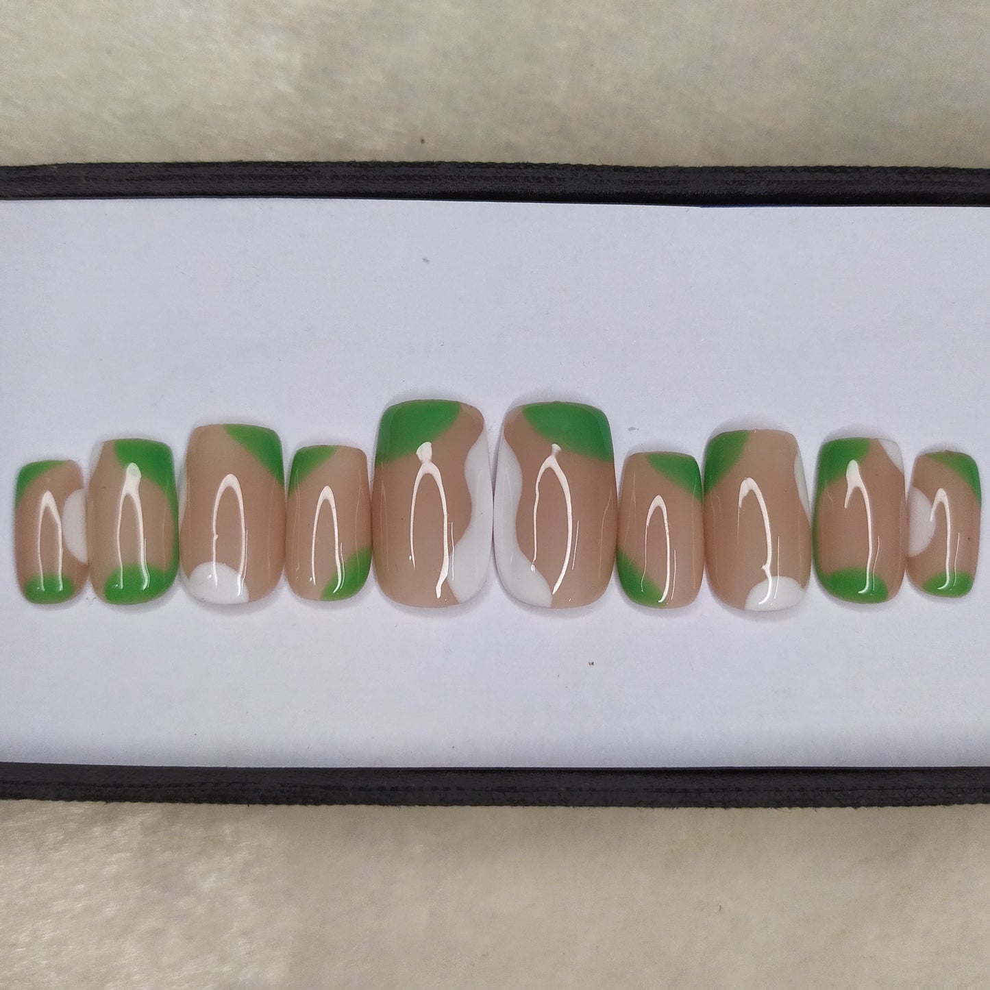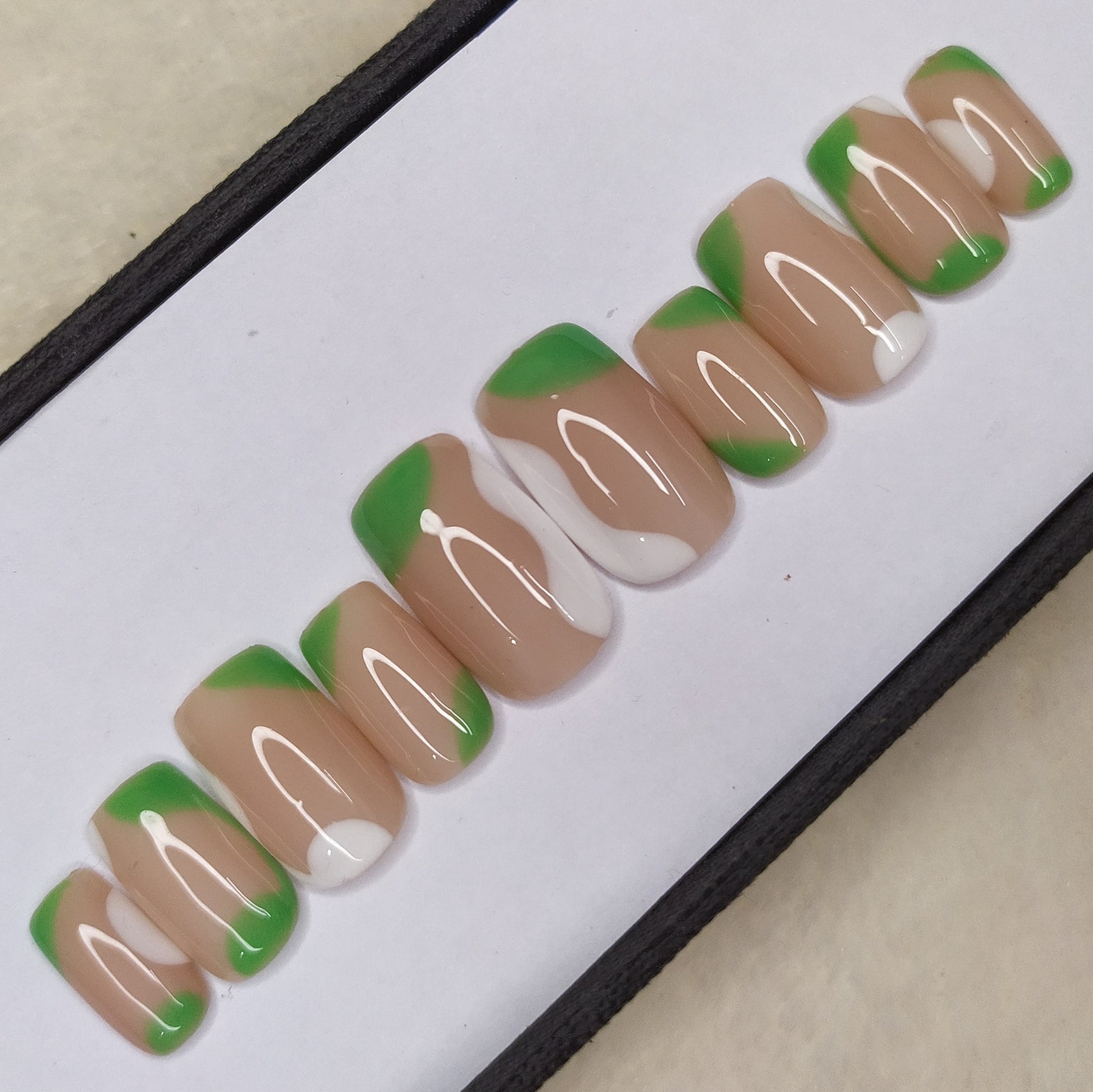Glossy White and Green Abstract Press on Nails Set // 552