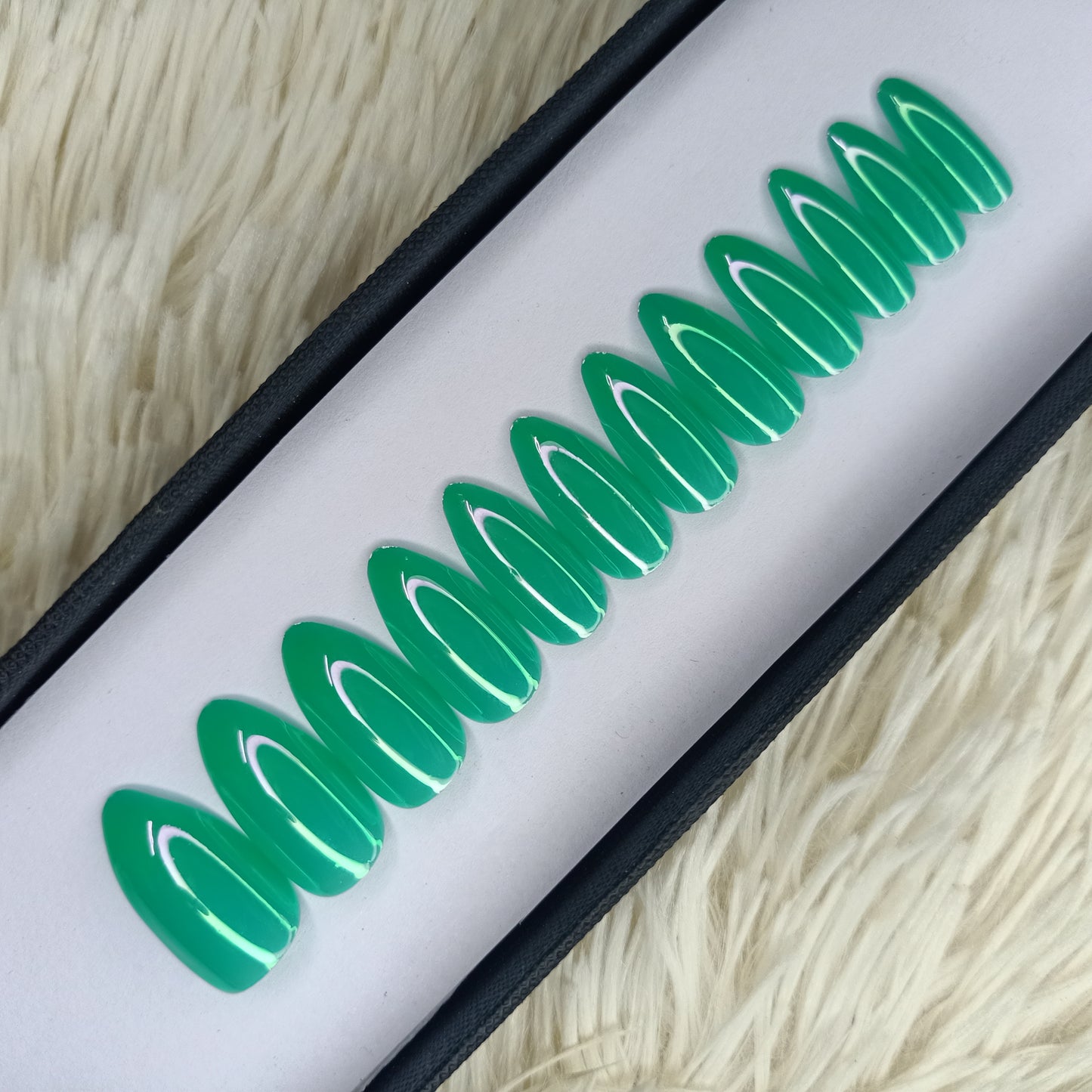 Green Chrome Press on Nails Set in Almond ready to ship 279