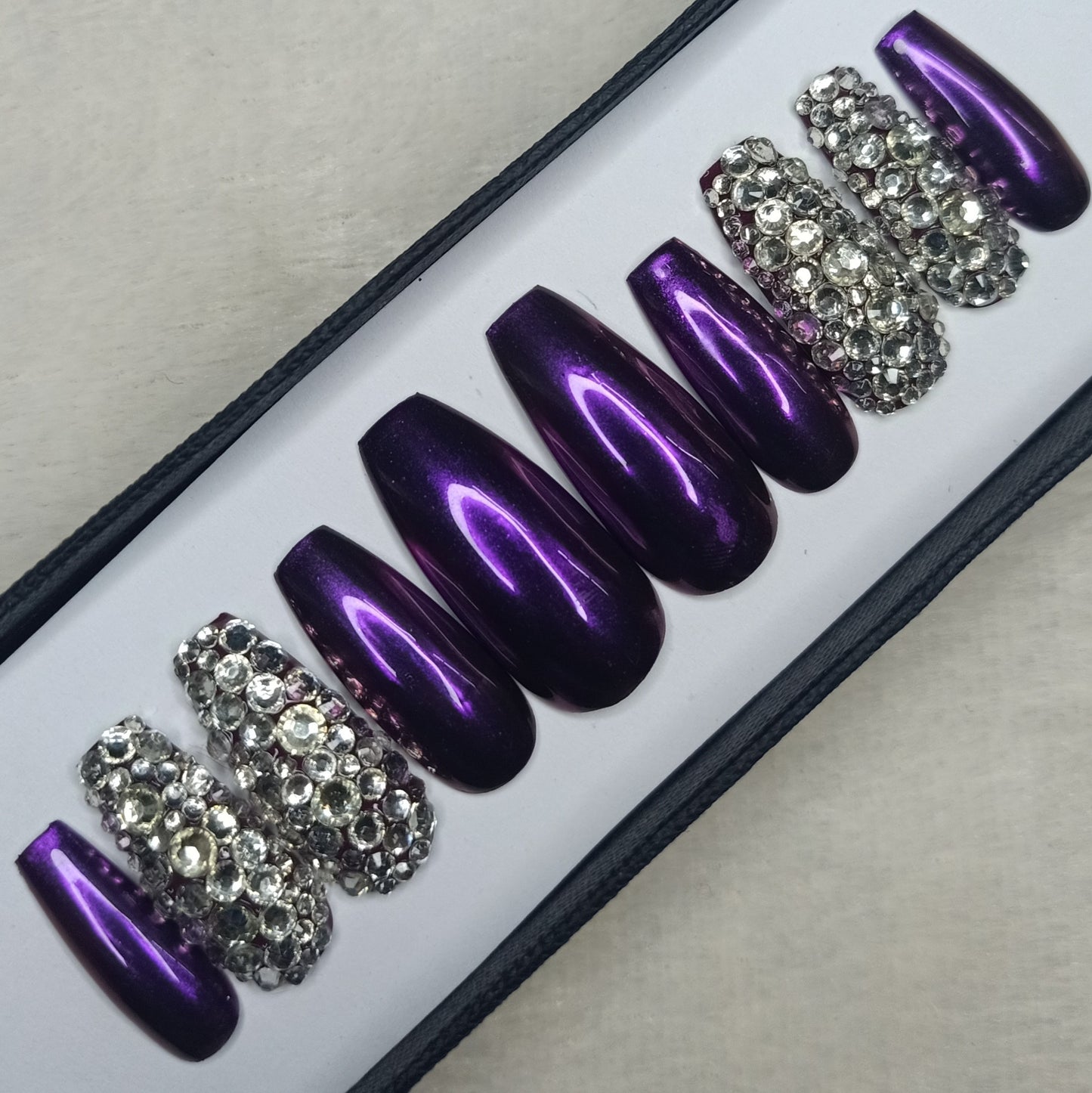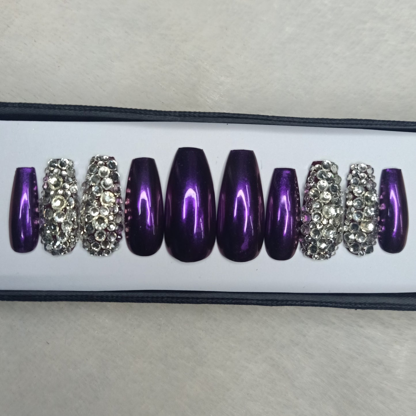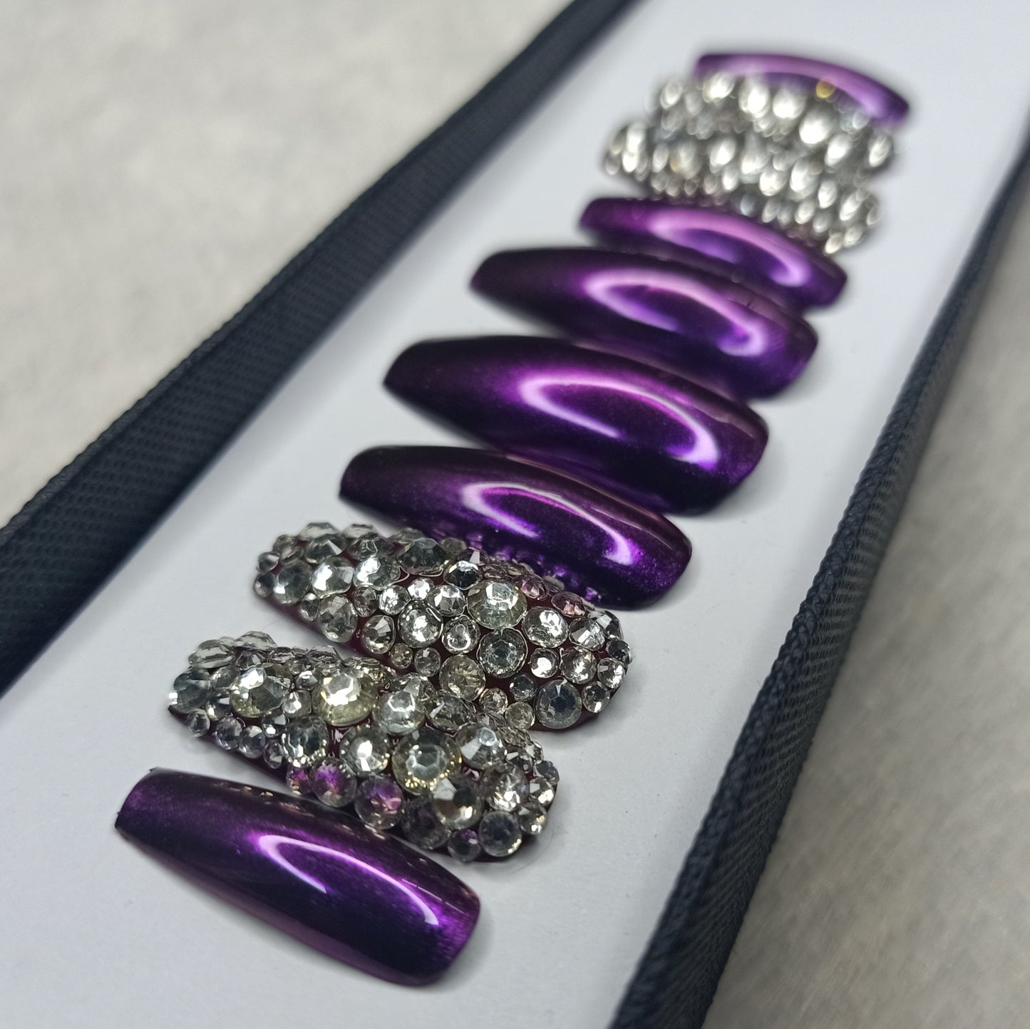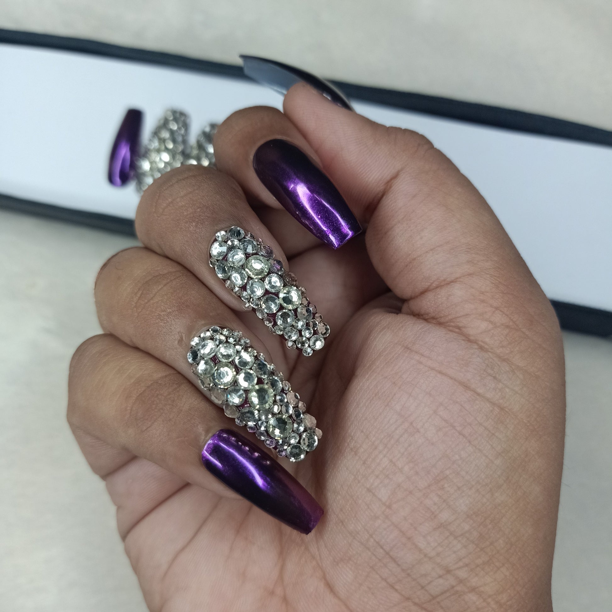 Lux Collection : Glossy Purple Chrome Rhinestones Press on Nails Set // 573