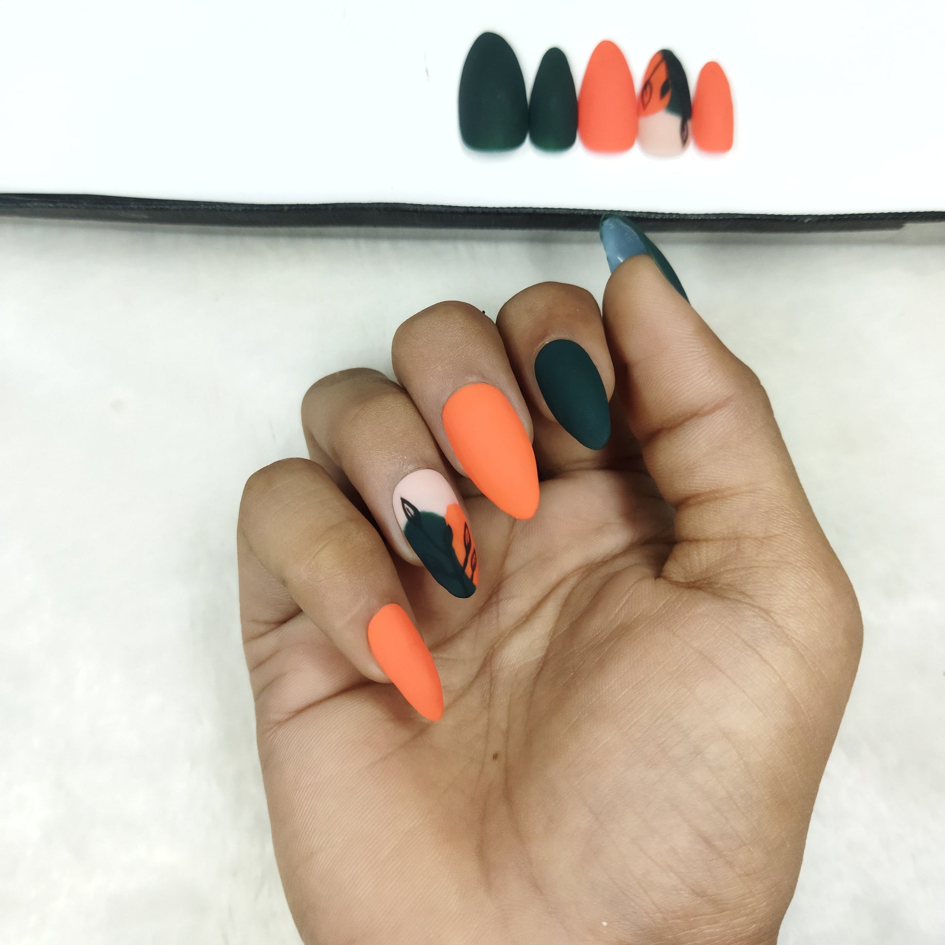 Matte Green & Orange Floral Print Press on Nails Set // 832