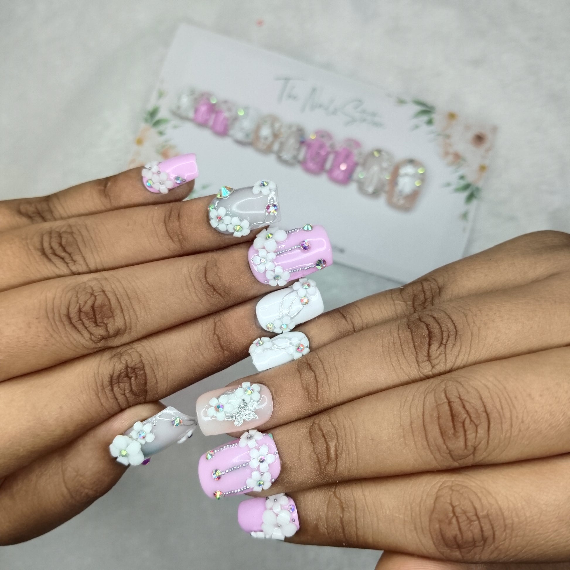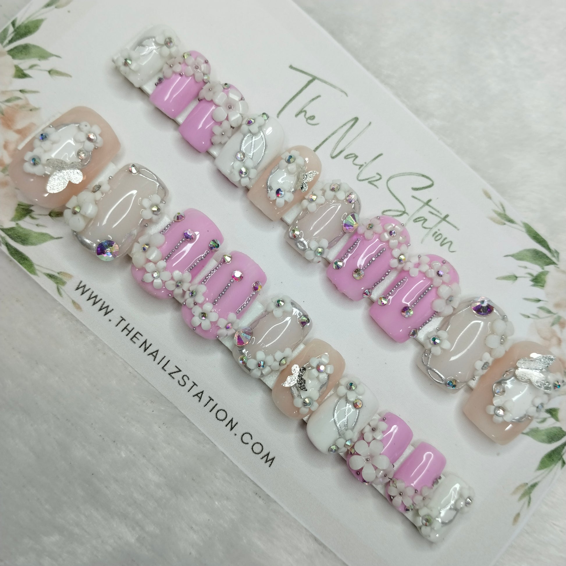 The NailzStation Glossy 3D Pink and Nude Flower Garden Press on Fake Artificial Nails Set with glue, filer, sticker application kit // 1392