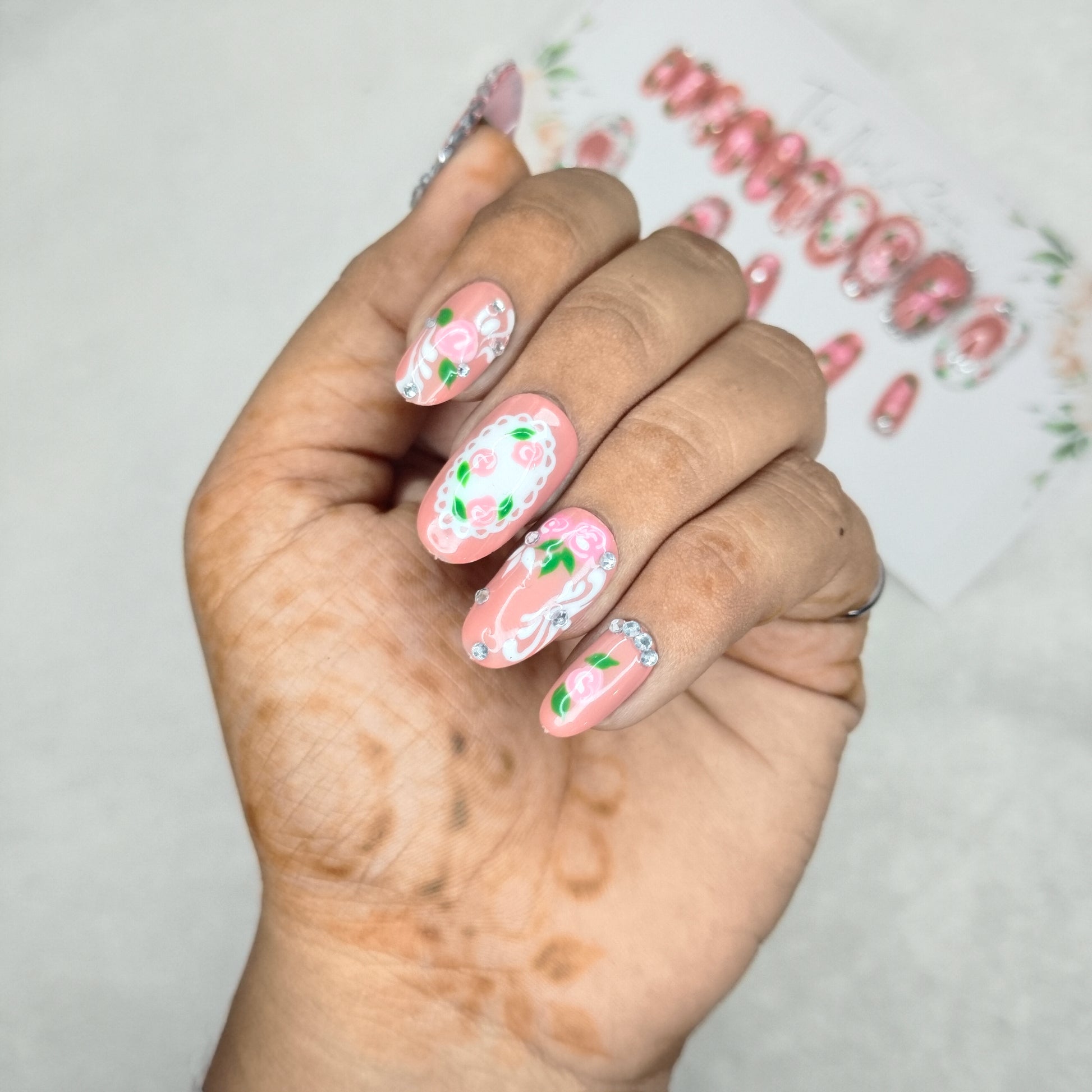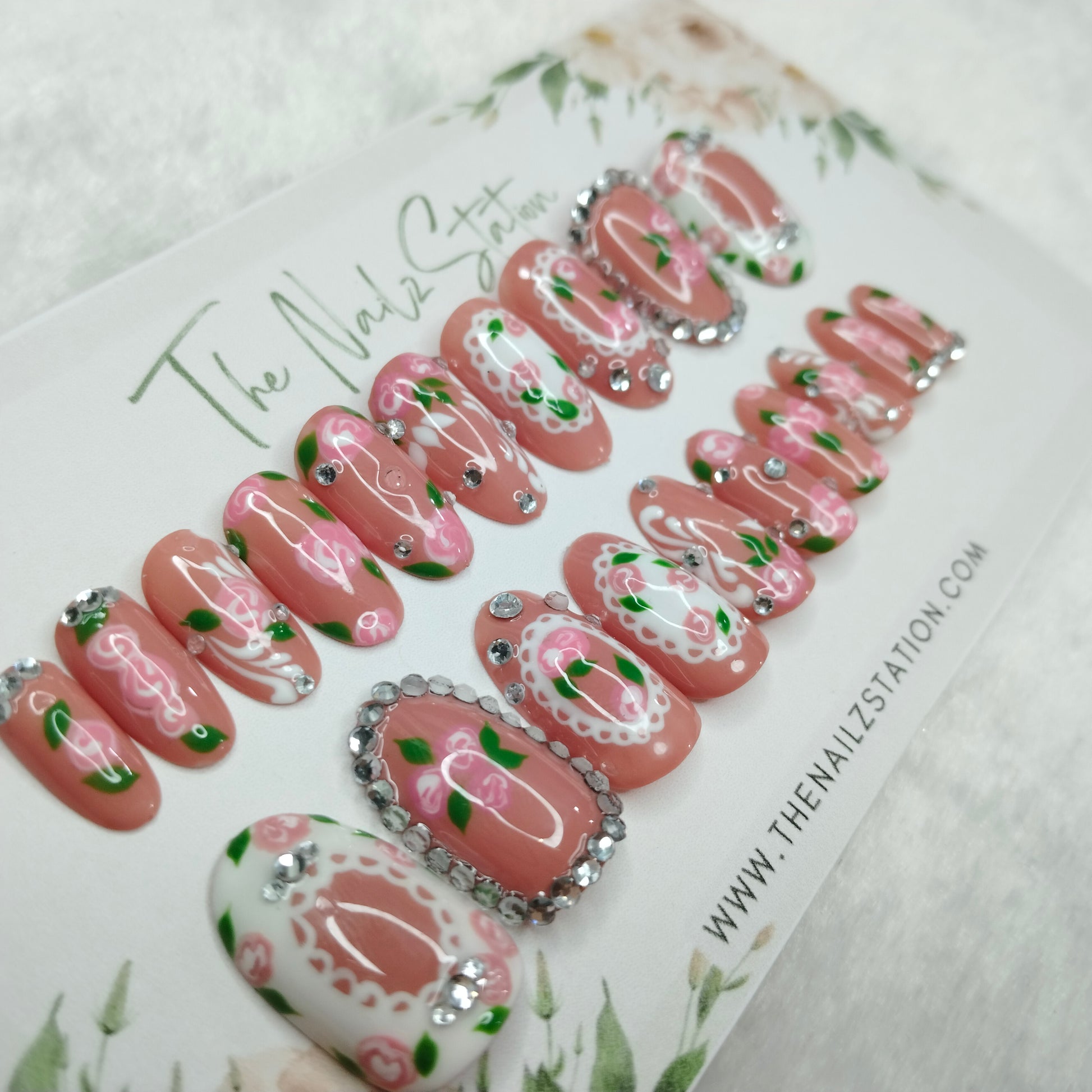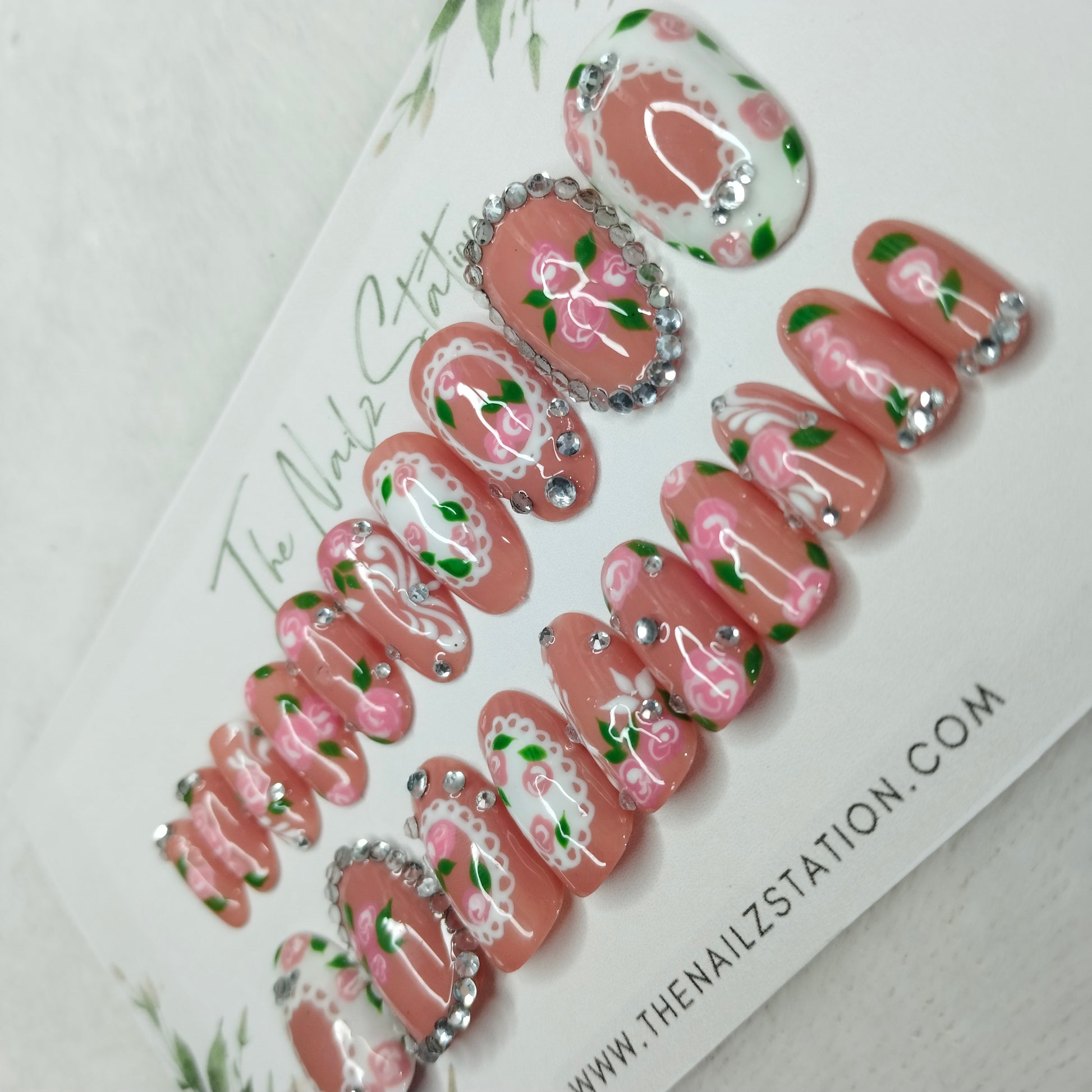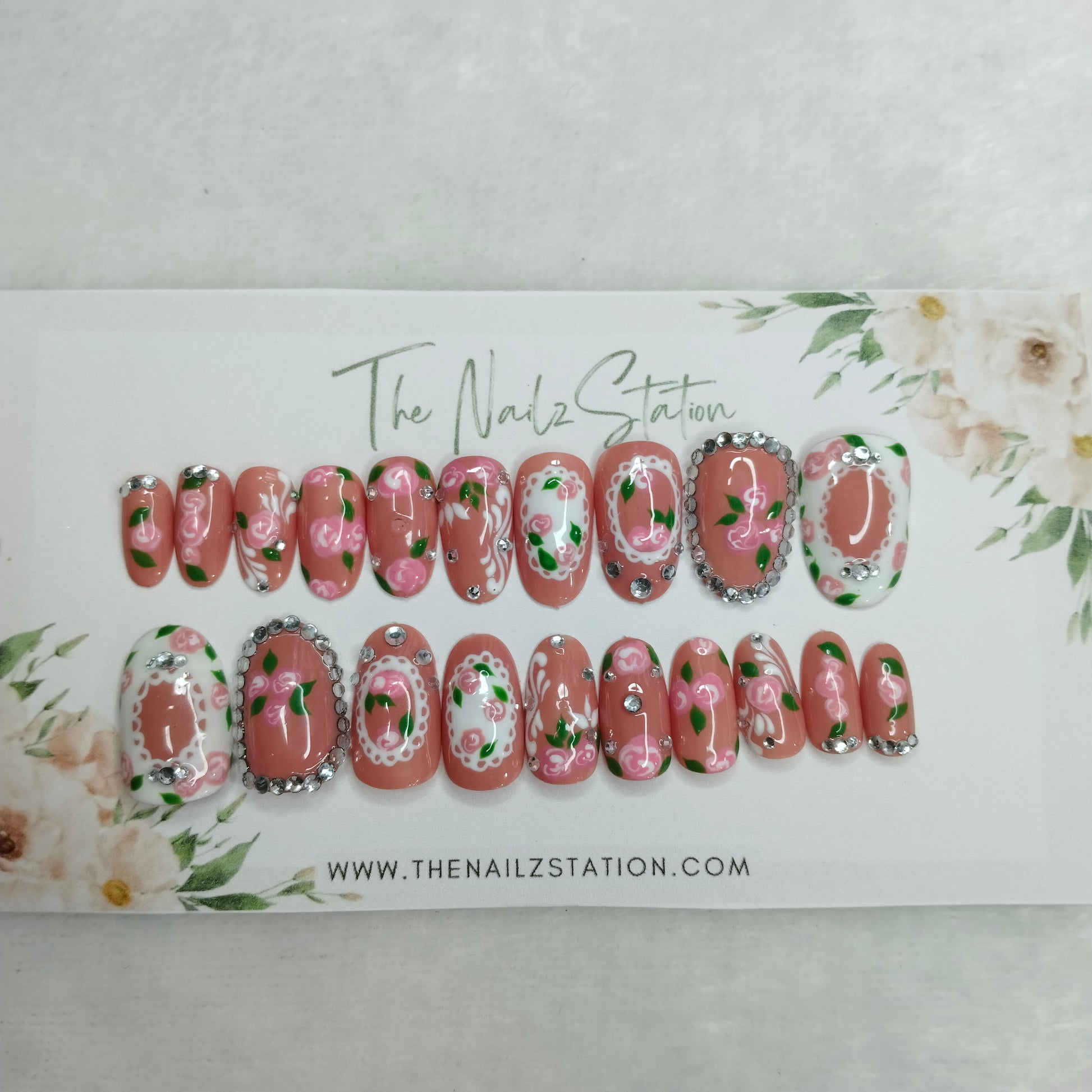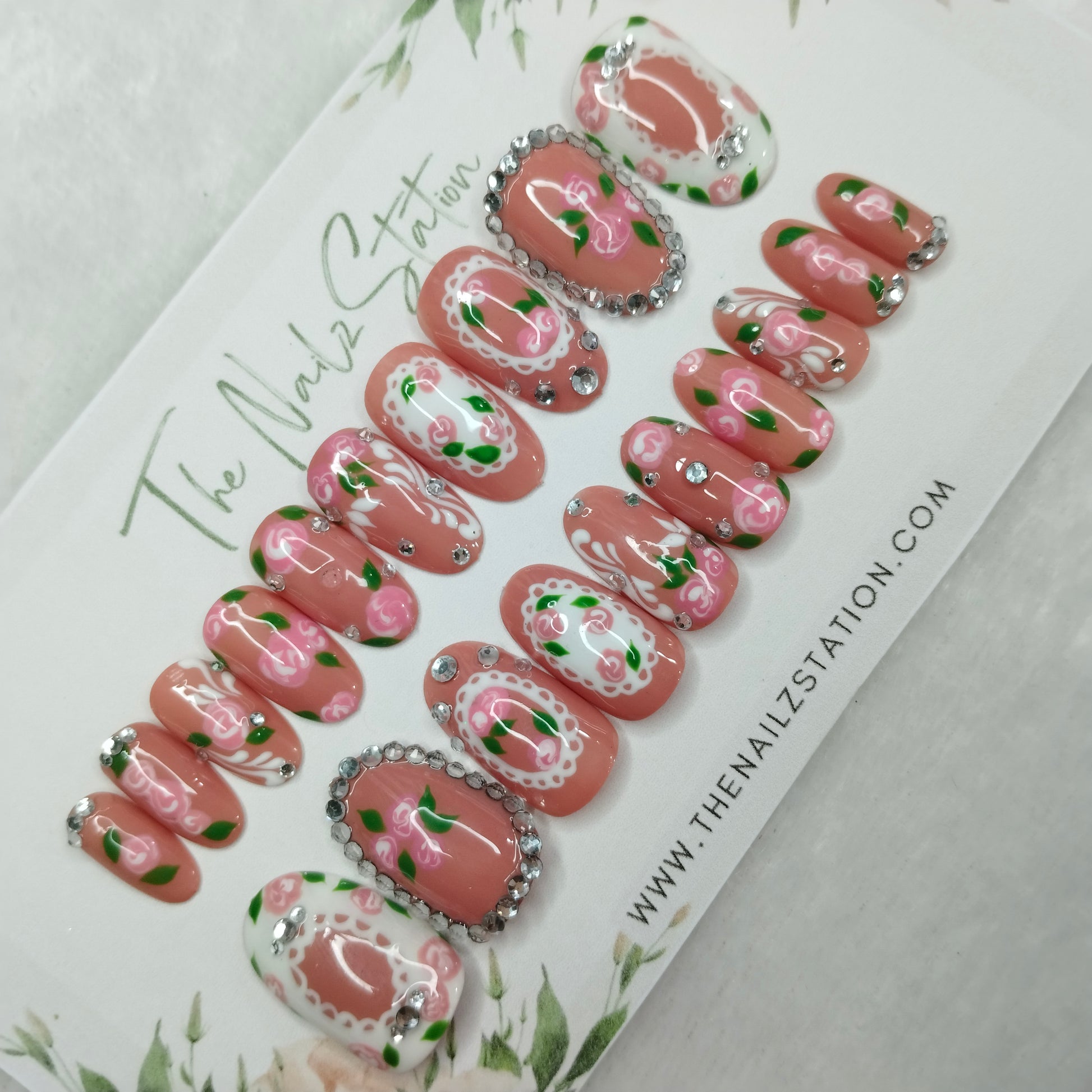 The NailzStation Glossy 3D Roses Nude Press on Fake Artificial Nails Set with glue, filer, sticker application kit // 1401