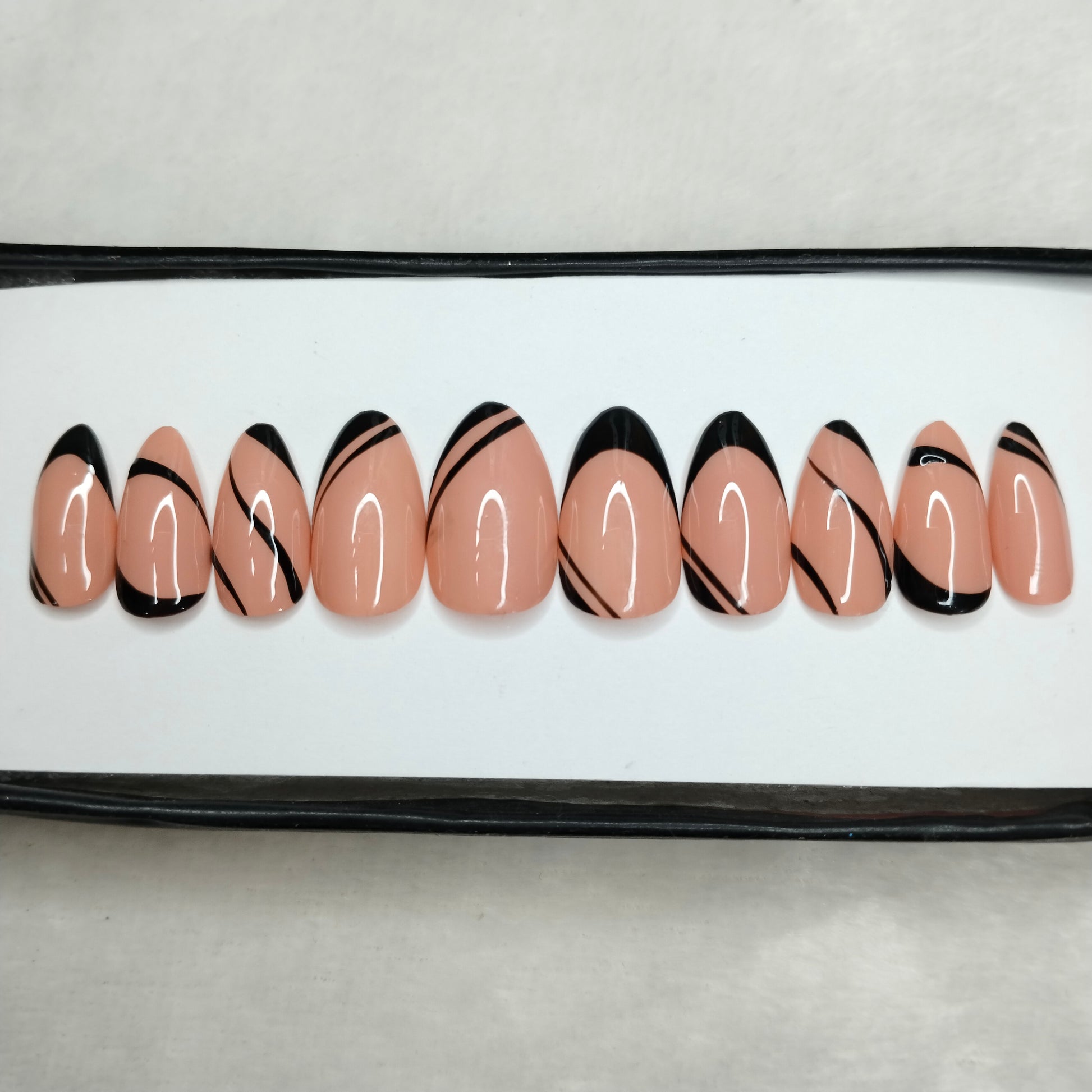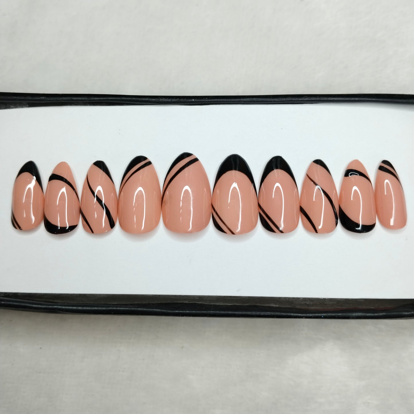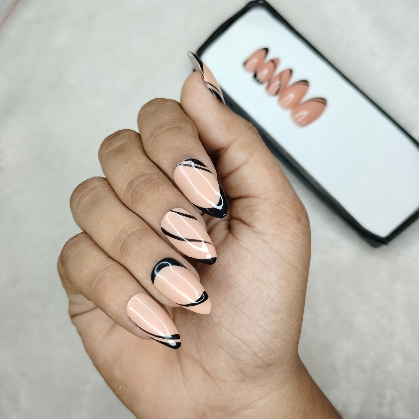 The NailzStation Glossy Black Swirls Press on Fake Artificial Nails Set with glue, filer, sticker application kit // 1190