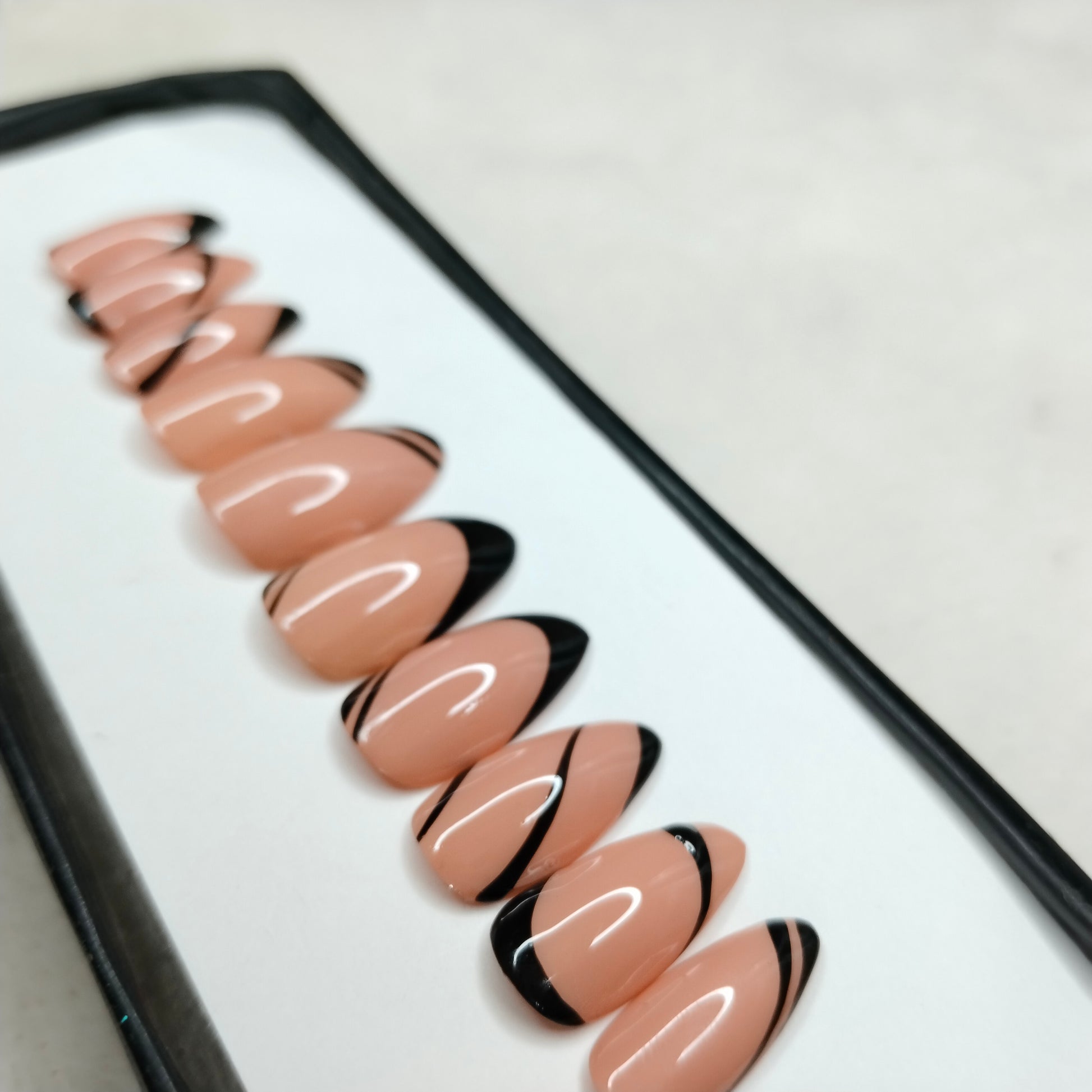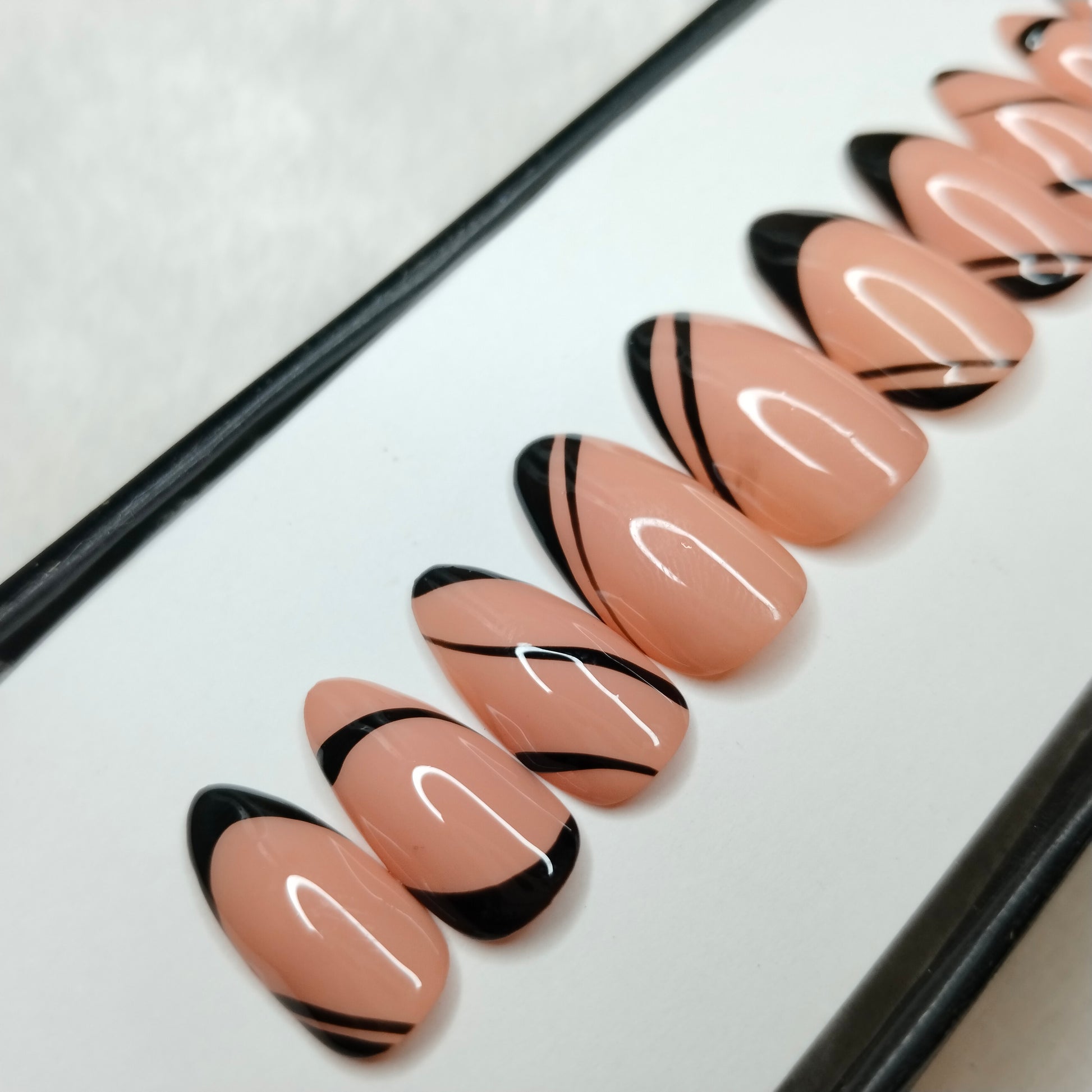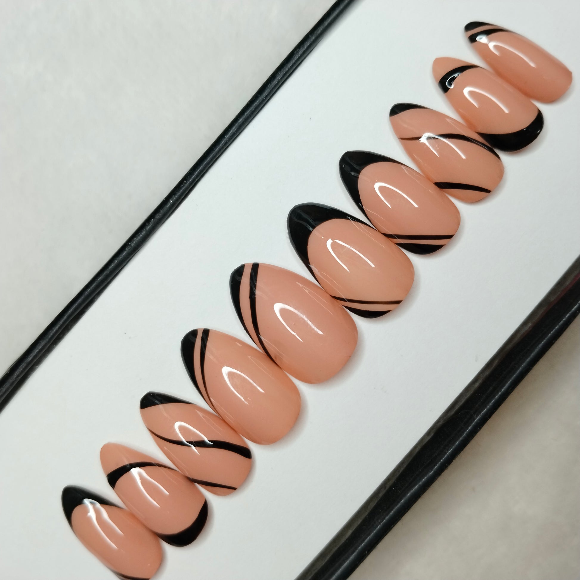 The NailzStation Glossy Black Swirls Press on Fake Artificial Nails Set with glue, filer, sticker application kit // 1190