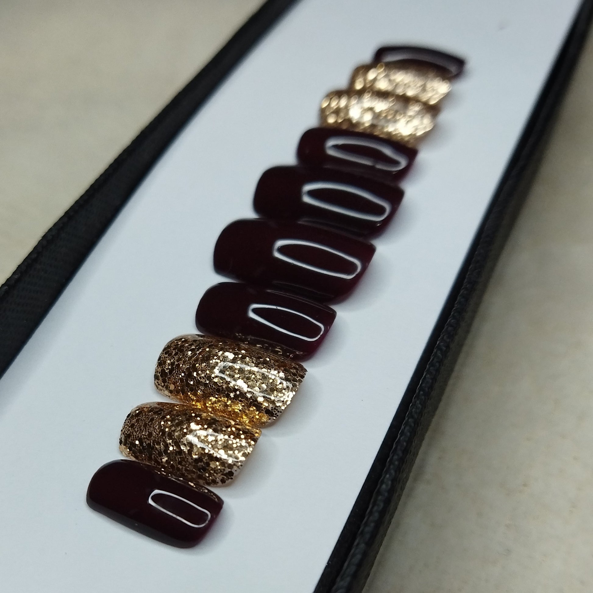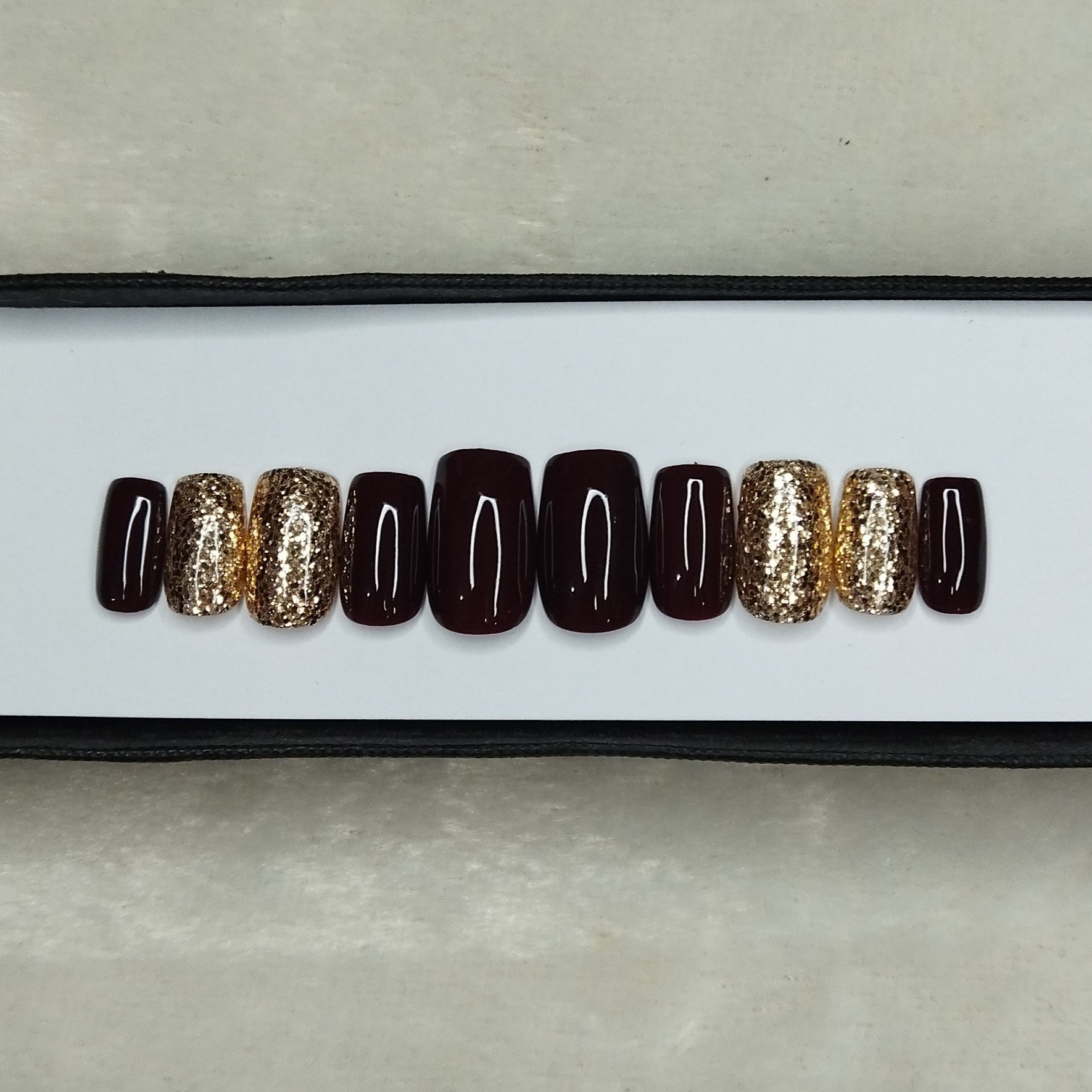 The NailzStation Glossy Dark Maroon Glitter Press on Fake Artificial Nails Set with glue, filer, sticker application kit // 1310