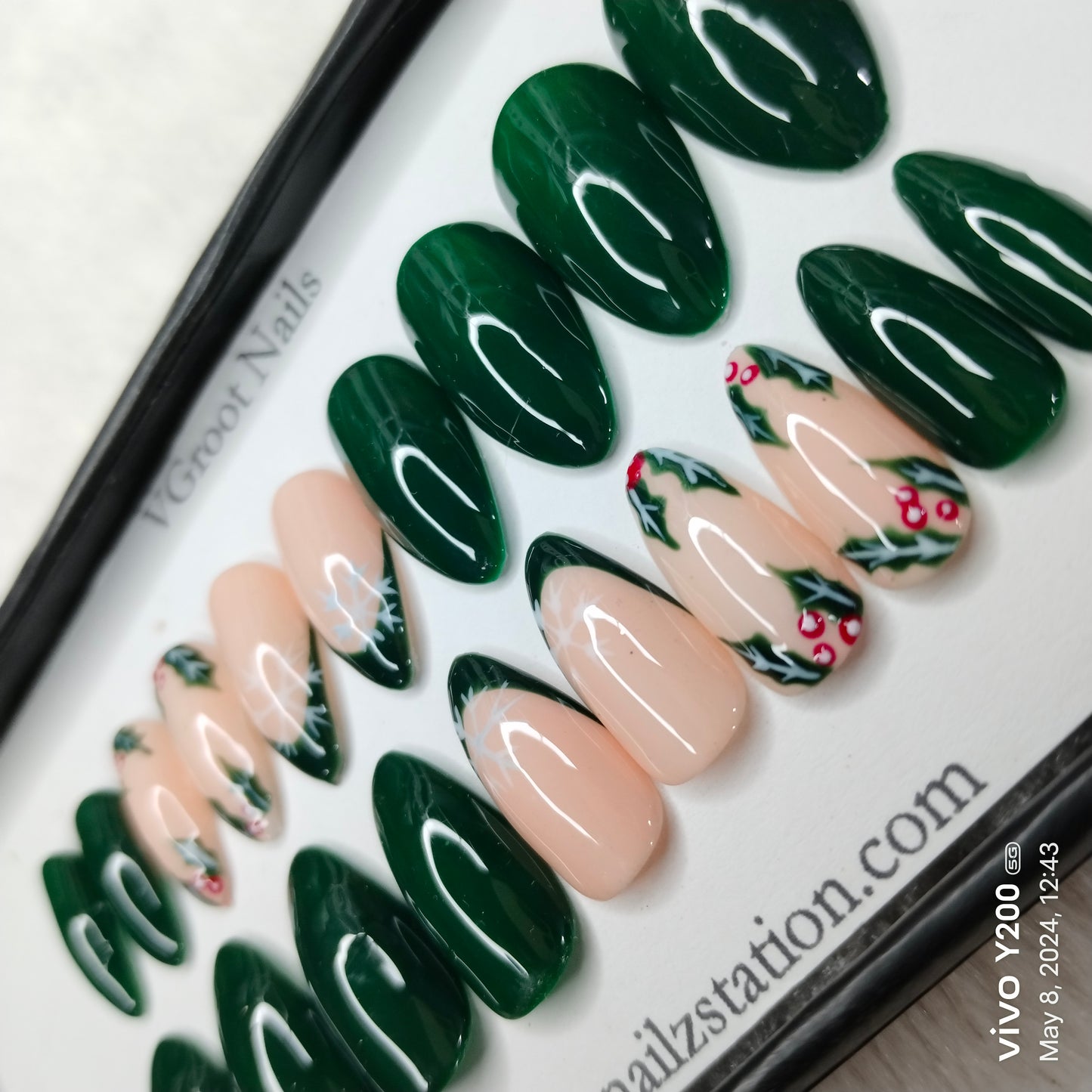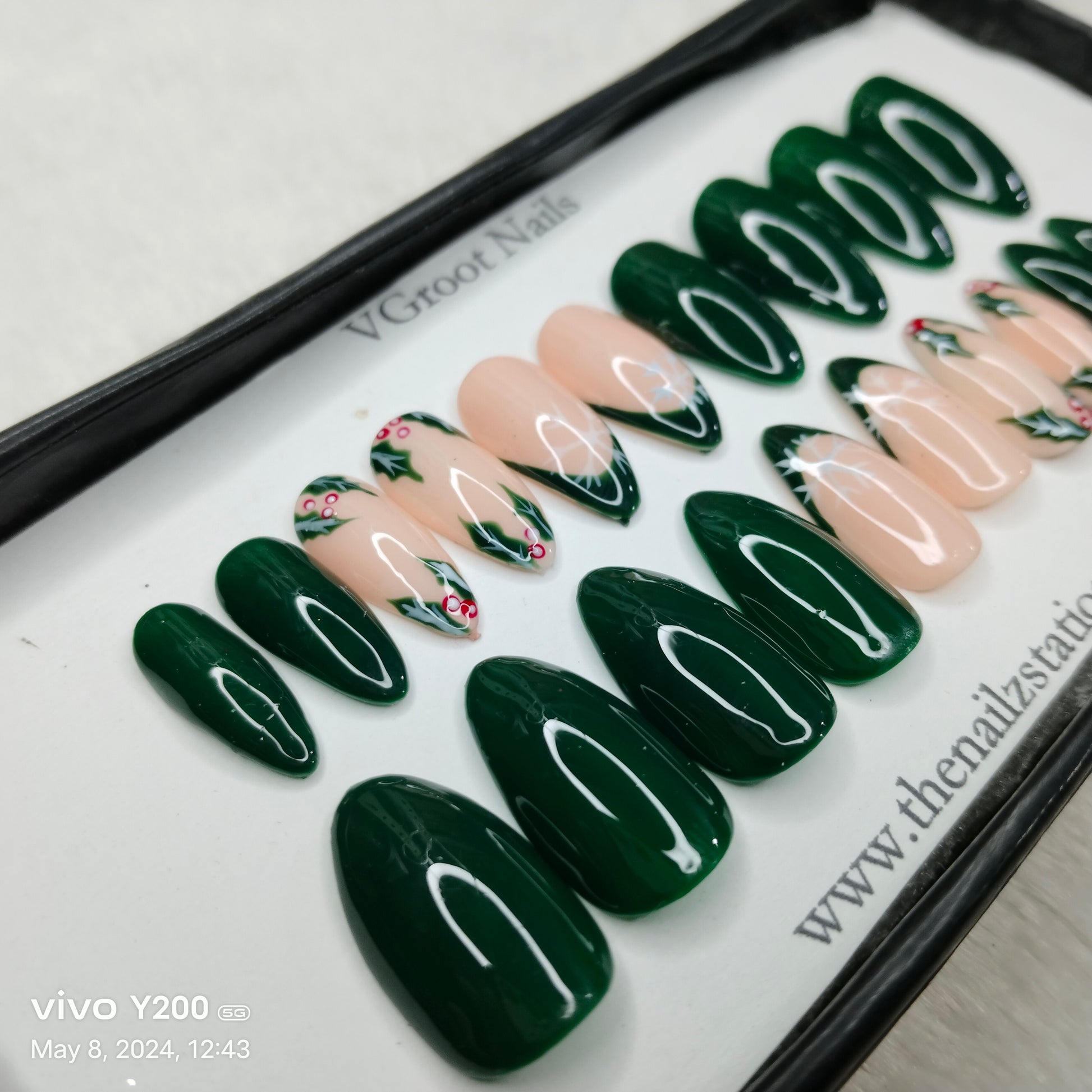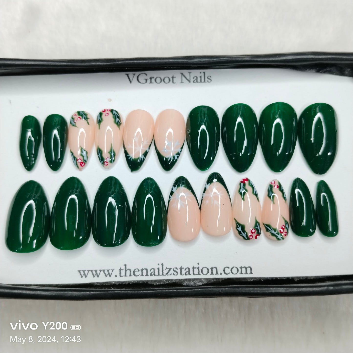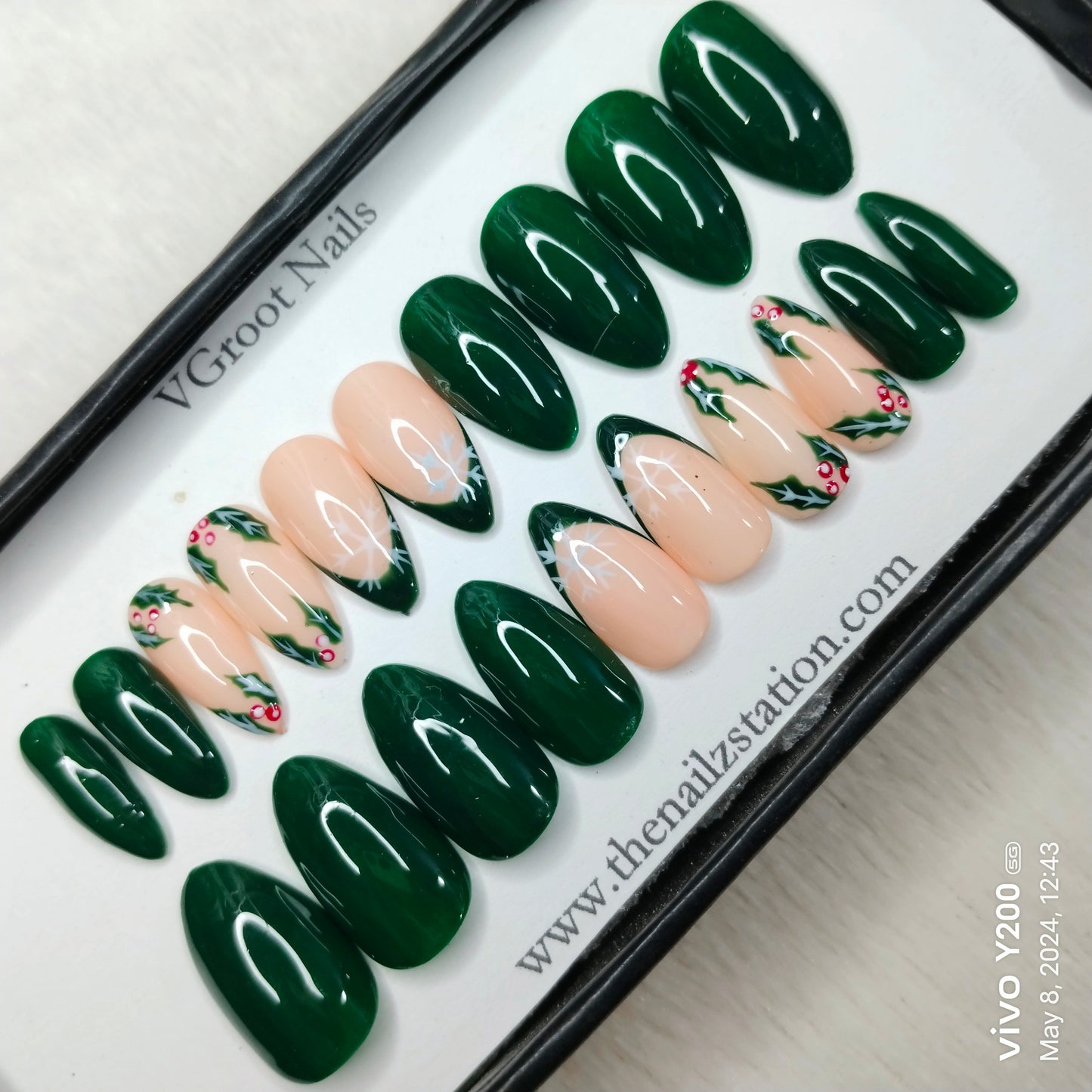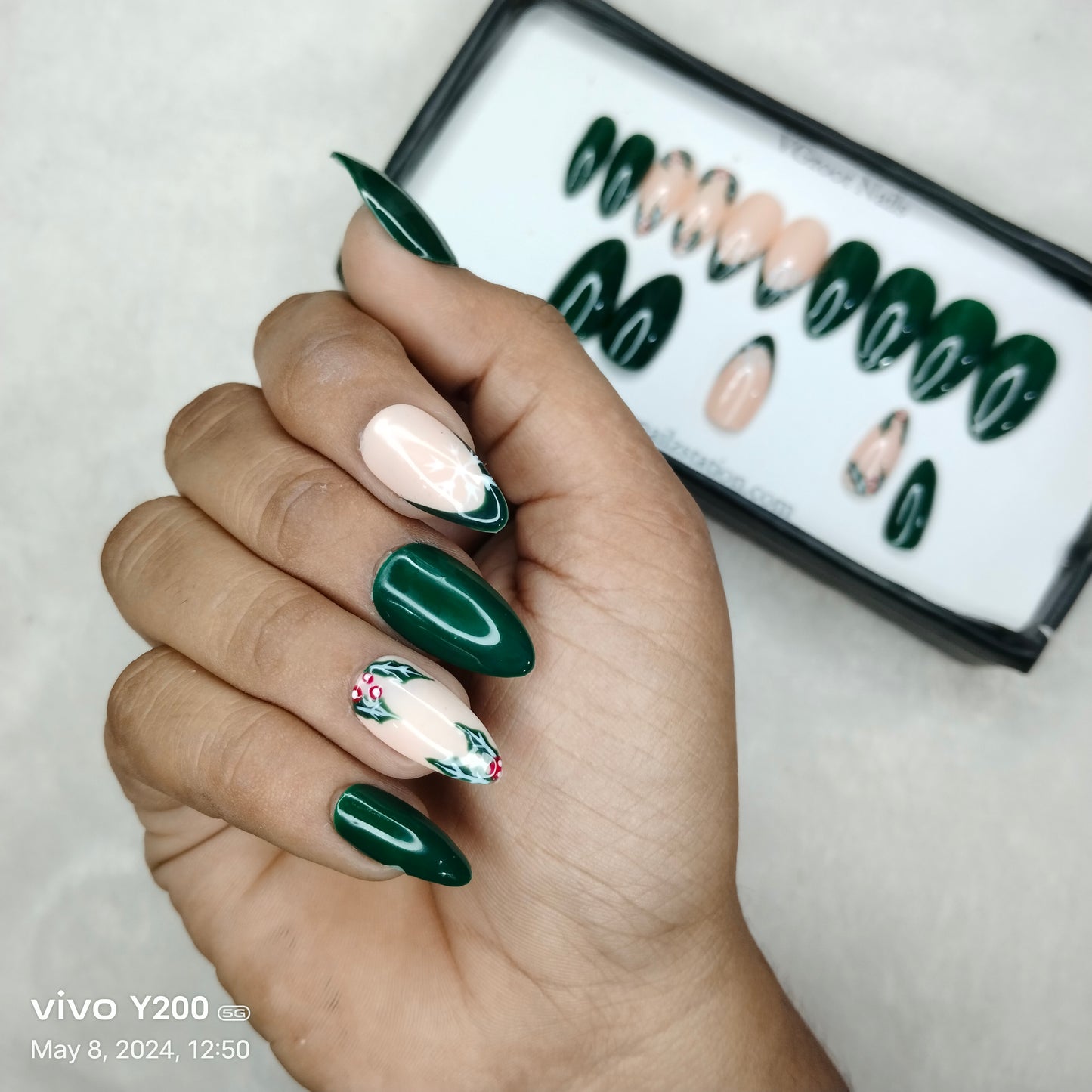 The NailzStation Glossy Green Christmas Floral Press on Fake Artificial Nails Set with glue, filer, sticker application kit // 1164